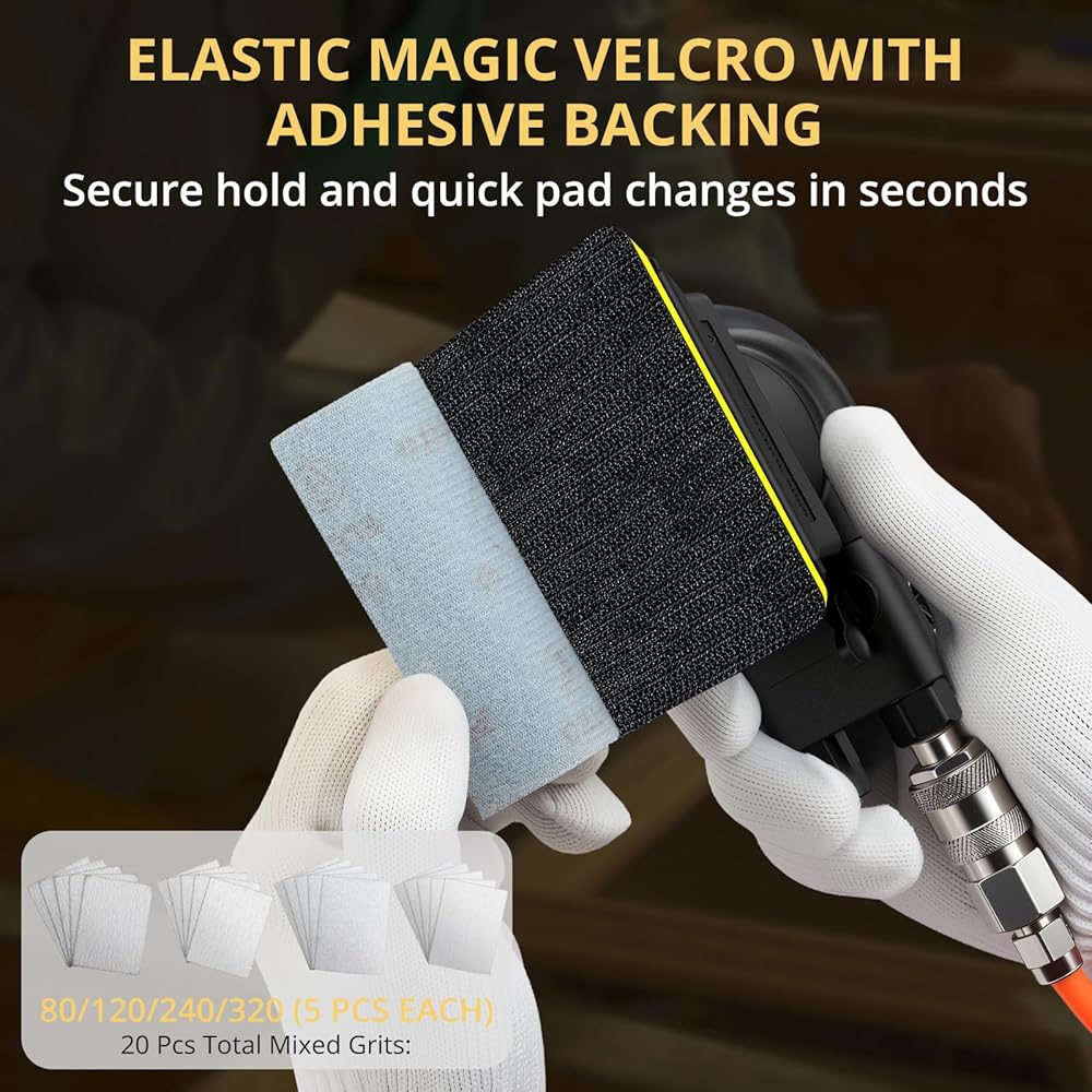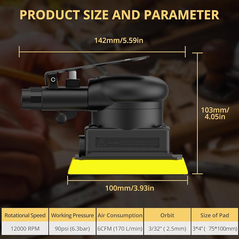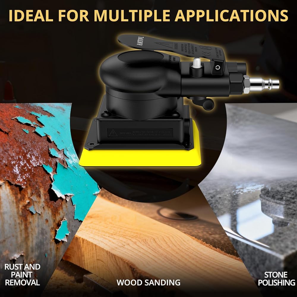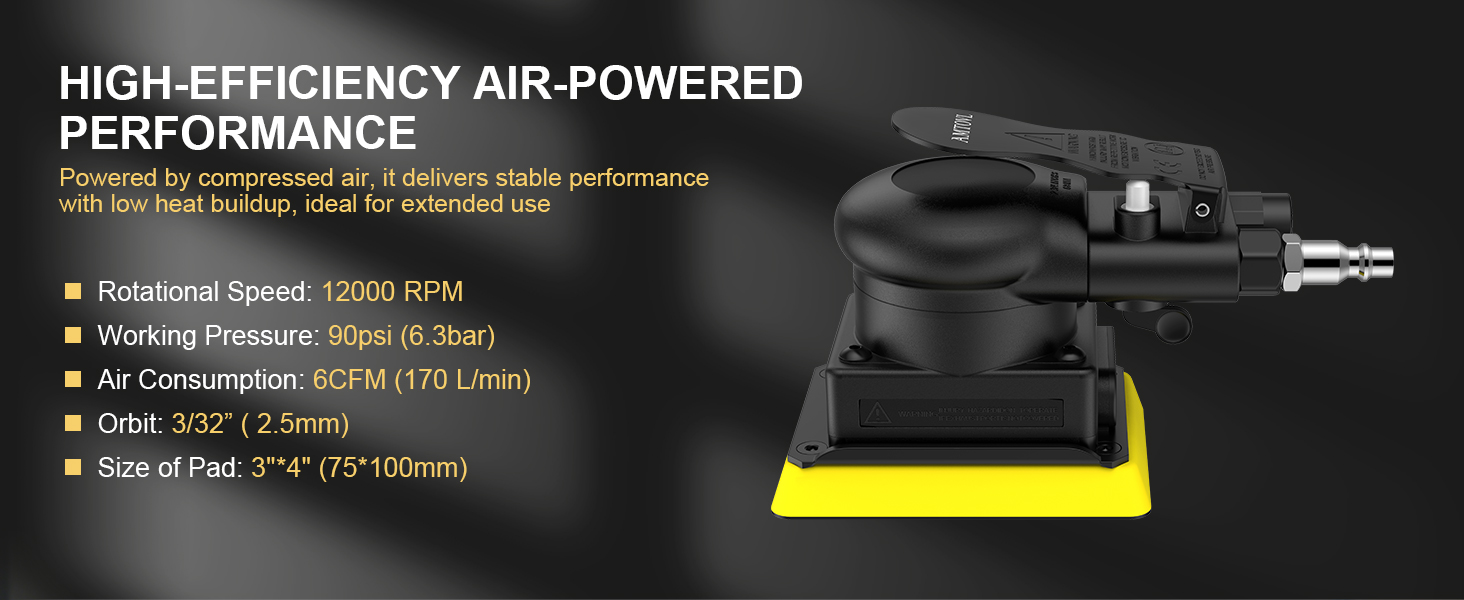 【High-Efficiency Air-Powered Performance】Delivers up to 12000 RPM with a balanced random orbital motion, providing fast material removal while maintaining smooth, consistent sanding results