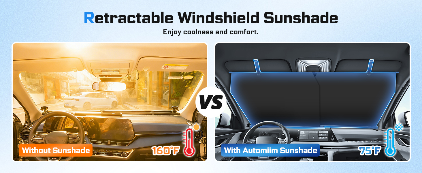 【Superior Sun Shield Protection】 Cool Cabin & Long-Lasting Interior Preservation. As a top-notch sunshade for car windshield, our windshield sun shade is constructed with ice crystal cooling fabric and 420D material. It blocks 99% of damaging UV rays, reduces cabin temperature to a comfortable 90°F, and prevents interior aging or fading from sun damage, easing the annoyance of hot cars in summer.