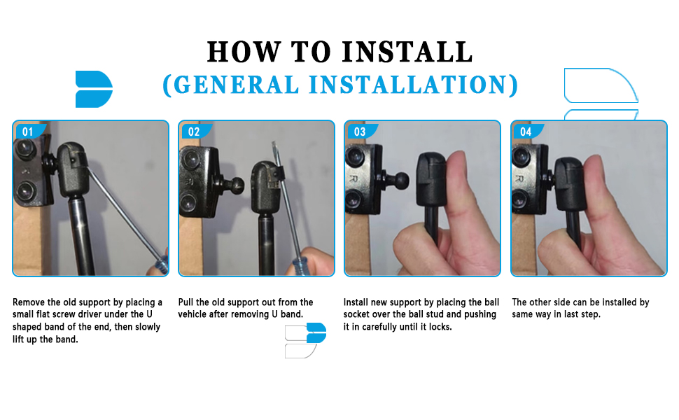 Directly Fit: OE replacement Lift Supports Shock Struts, directly fit. Easy installation, no special tools required, just need to use a flathead screwdriver to pry the old bracket and installthe new lift arm on. Before installing the parts, prop up your hood or the heavy hatch by a rod or helper to stay away from harm. High strength leak-proof piston seal. Superior rod finish resists corrosion. Easy lifting and reduce closing effort. 100% brand new and tested to meet or exceed OEM specifications