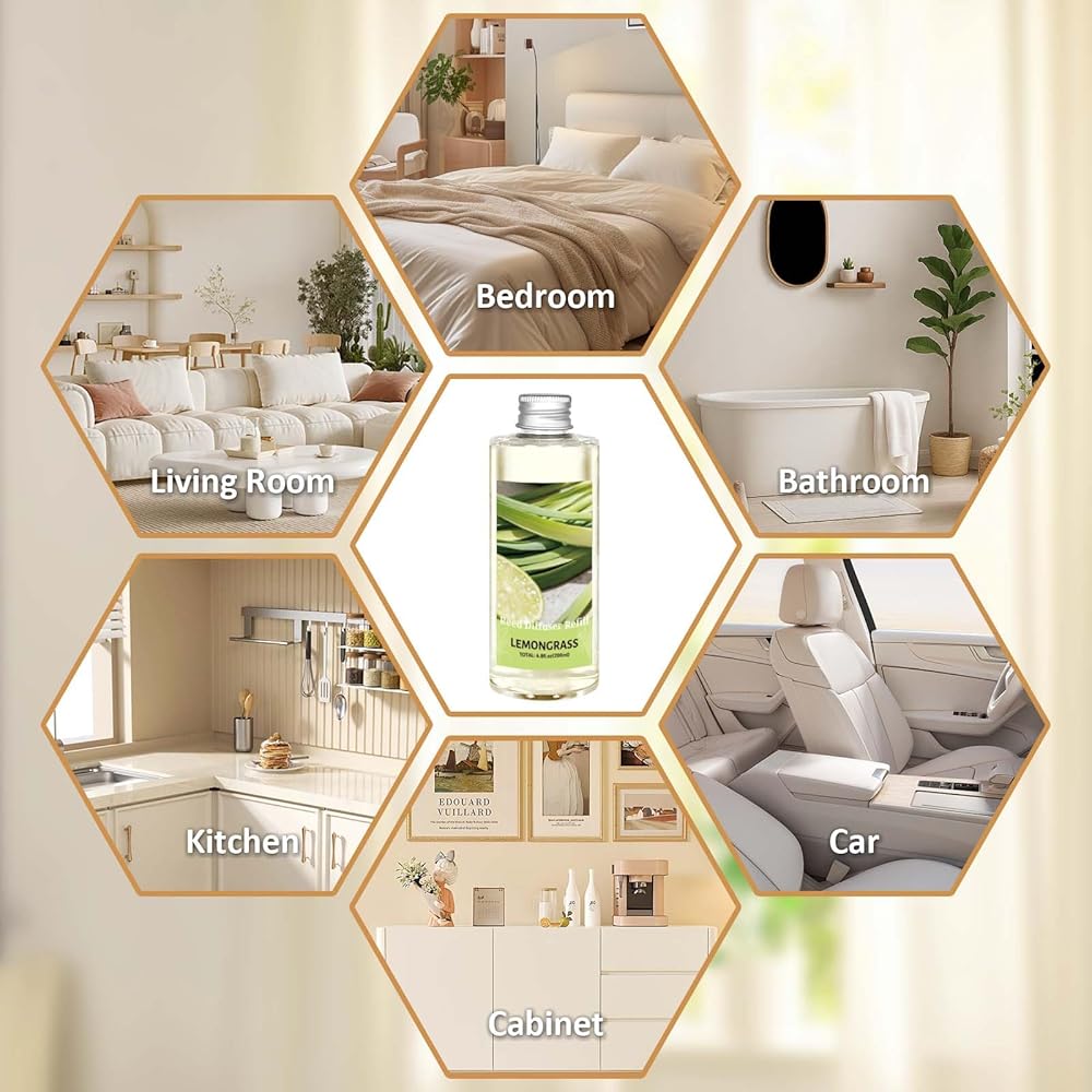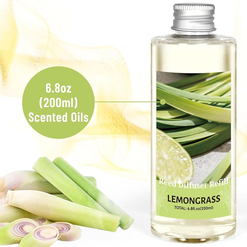 100% Natural Lemongrass Scent Essence: This reed diffuser refill is infused with Lemongrass essential oil and plant-based fragrance, offering calming floral notes. It is safe to use around kids and pets