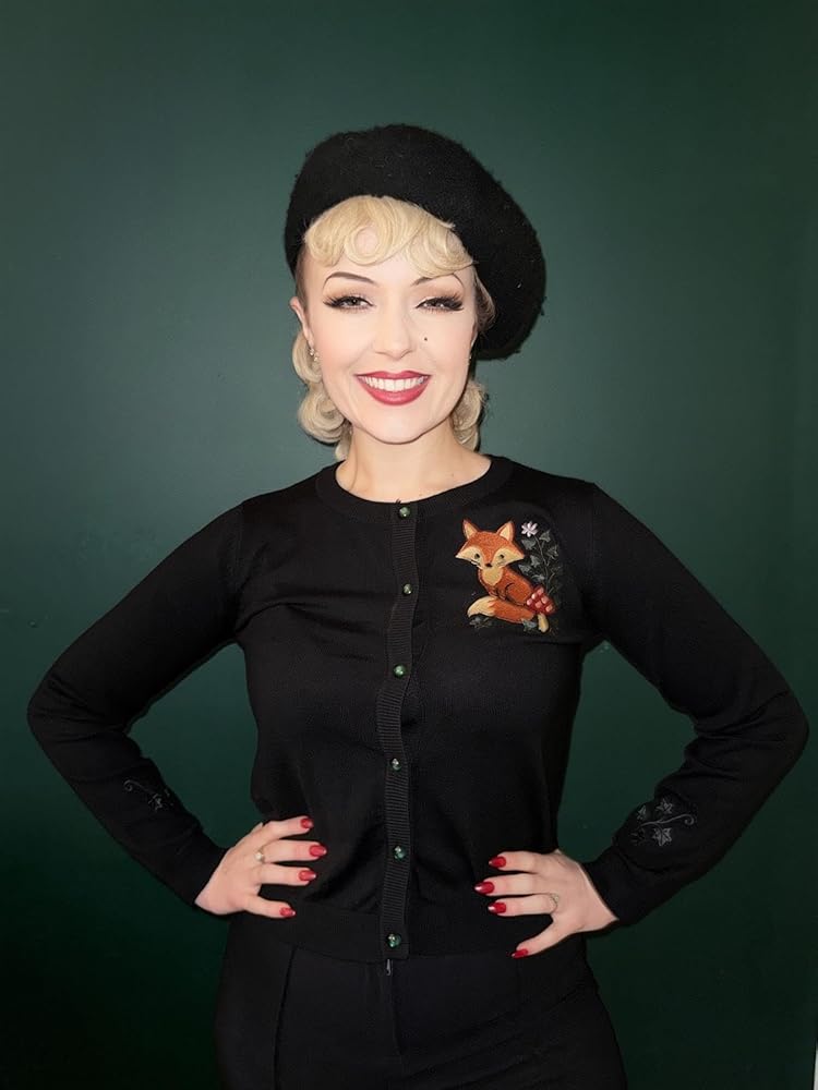 The Ro Rox Fox Cardigan is designed with unique fox embroidery and green ivy leaf details. Crafted from 70% rayon and 30% nylon, it is soft, lightweight, and durable. Dome shaped buttons in a green glass effect add vintage-inspired charm, making this cardigan stand out as a signature Ro Rox design. Perfect for layering with dresses, skirts, or jeans, it brings both comfort and character to your wardrobe. Available in sizes XS (4) to 4XL (18).