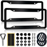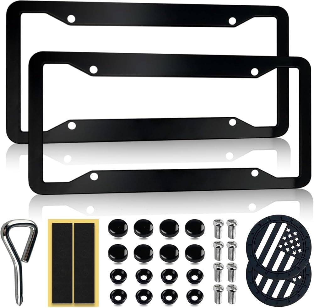 2 Pack OLLEN Gloss Black License Plate Frames, Aluminum Alloy Heavy Duty Car Tag Holder Protector, with Mount Hardware, Car Cup Coasters, Anti-Theft Caps, Rattle Proof Pads, Screwdriver, Black