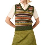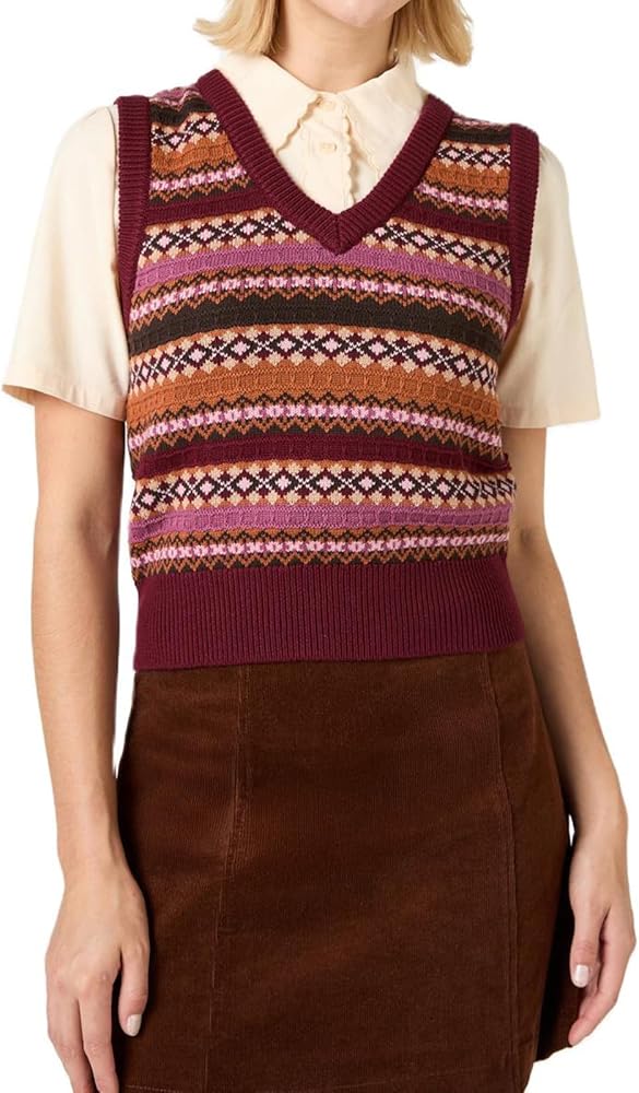Feature: Striped color block, colourful knit vest, ribbed hem and sleeveless design, v neck sweater vest, slim fit, vintage argyle print cropped sweater vest junior streetwear, vintage 70s knitted vest pullover tops, boho pattern knitted sweater vest