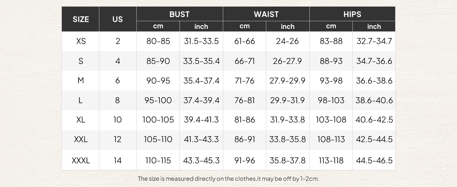 Garment Care& Our Size: Hand wash cold hang dry recommended, machine washable. Do not wring or twist, low iron to remove wrinkles if necessary. Size Guide: S--US 4, M--US 6, L--US 8-10, XL--US 12, XXL--US 23. NOTE: Measurements should be taken directly on your body.Please refer to the size measurement chart to find the most suitable size before purchasing.