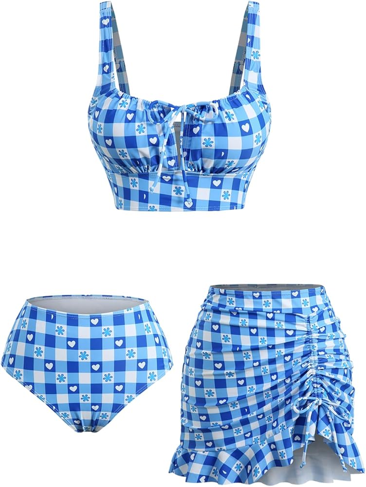 Vintage-Inspired 3-Piece Set: This unique collection includes a floral & plaid print top, high-waisted bottoms, and a matching sexy heart-printed bandeau. Mix and match the pieces to create multiple stunning looks for your retro beach day or poolside getaway.
