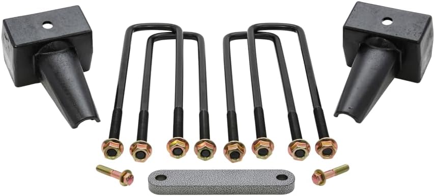 ReadyLIFT OEM-style rear block kits are available for 2017-2023 Ford Super Duty F350/F450 DRW model-specific applications. These 4.0" fabricated steel Rear Block Kits include two (2) rear blocks, a billet drive line spacer, four (4) long e-coated u-bolts and eight (8) nuts and washers. Based on OEM designs and never made out of lightweight extrusions, our 4" 2017-2023 Ford Super Duty Tapered Rear Blocks have Integrated OEM style bump stops. ReadyLIFT Block Kits will put a slight rake back in your truck for hauling or towing and are designed to work with your ReadyLIFT Suspension Leveling Kit. In fact, these blocks are the ideal Tow Package upgrade for not only for stock height vehicles but lifted or leveled trucks too! Like all ReadyLIFT products these block kits come with our Limited Lifetime Warranty. NOTE: 66-2742 4" block is for use on 2017-2023 Ford F350/F450 Dually Super Duty 4WD trucks with 2-piece drive shaft. Lift height will vary depending on what factory block your truck has. NOTE: The lift blocks in this kit are not designed to work with aftermarket or factory add-on air spring/load leveling kits that attach to the bump stop tangs. Use of this type of air bag system will void all block warranties and can cause failure of the block bump stop tang.