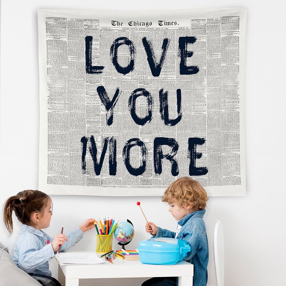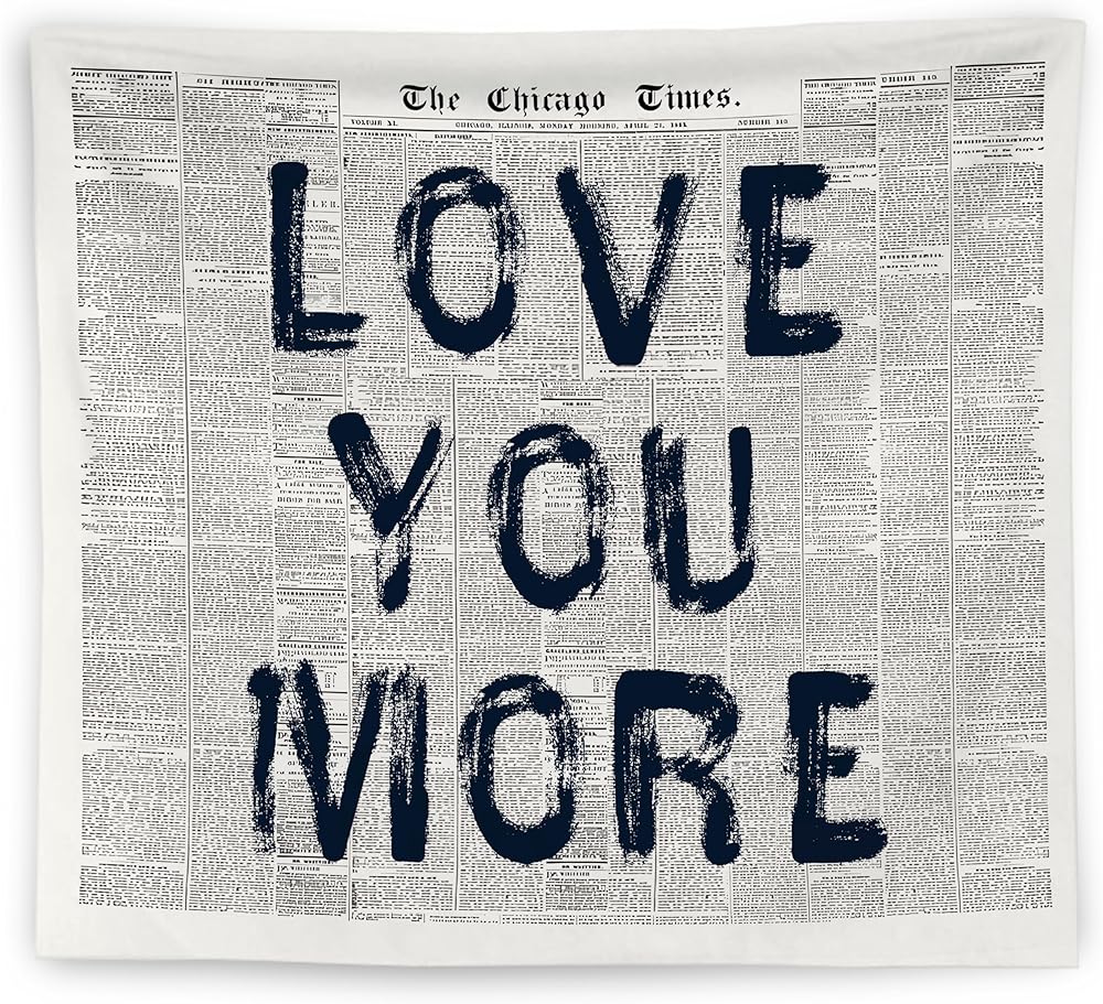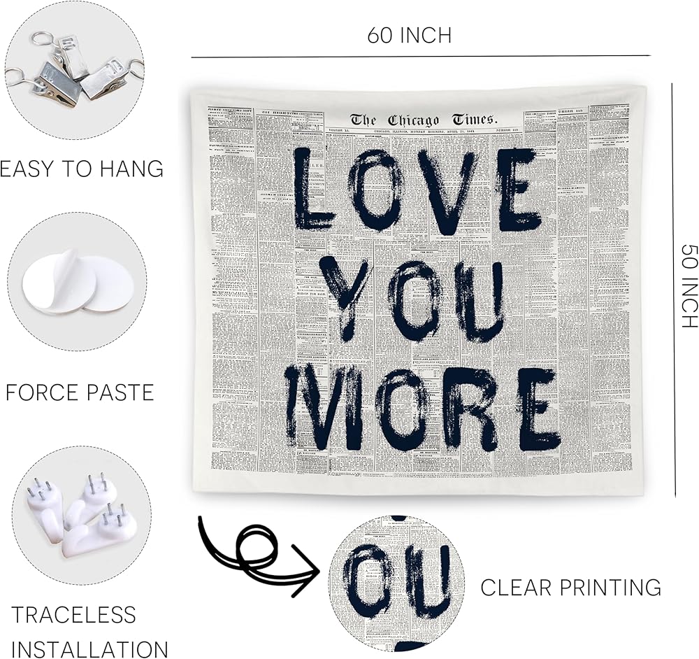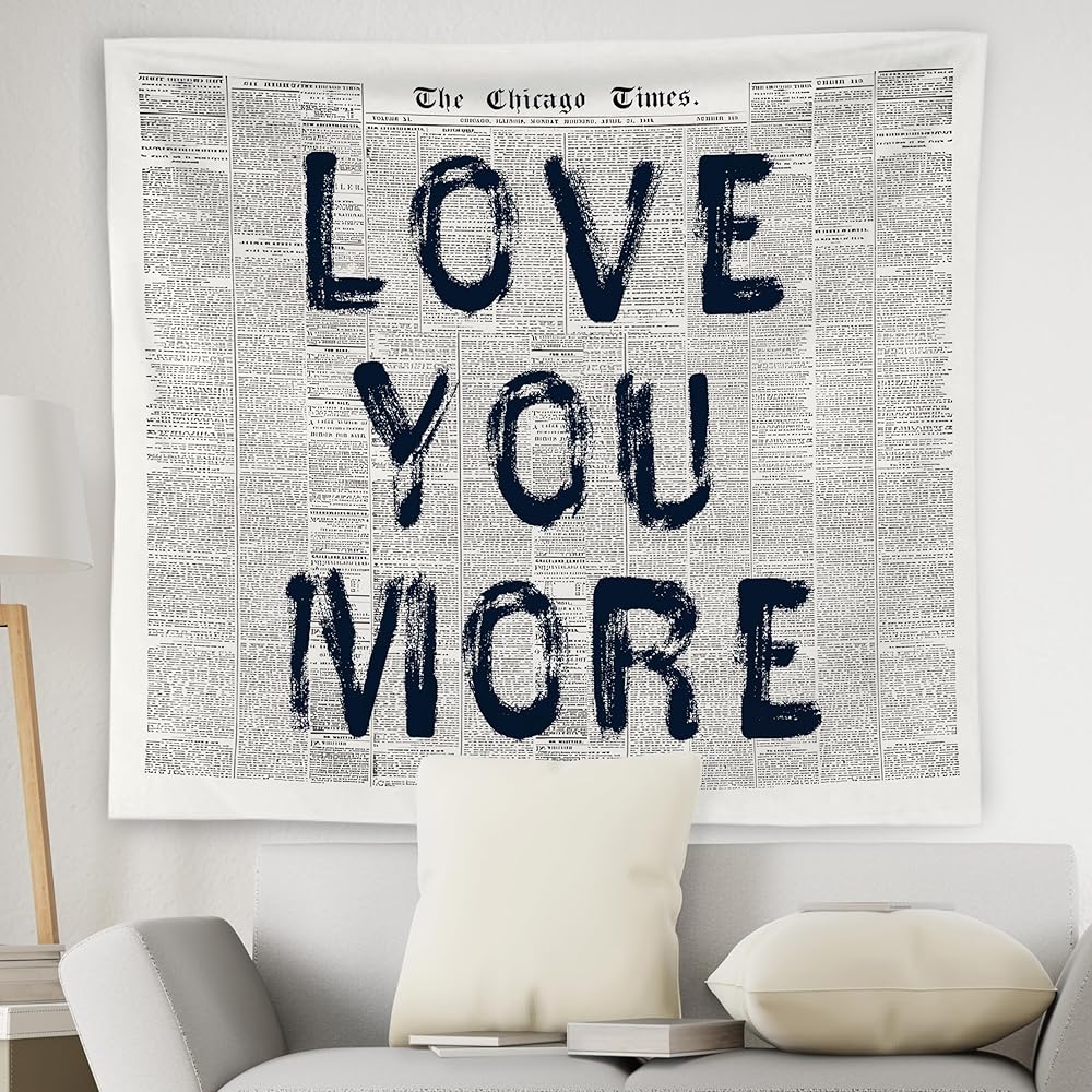 WNAGT Vintage Black and White Newspaper Tapestry Wall Hanging, Love You More Retro Funky Bold Typography Wall Blanket Decor for Dorm Apartment Bedroom Living Room Home, 50x60 Inch