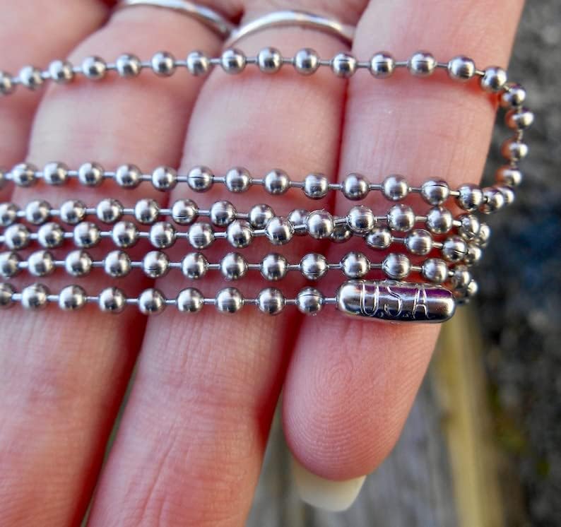 This is the same ball chain the US Military issues dog tag chain. #3 size dog tag chain has a 3/32" (2.4mm) bead diameter, is made of stainless steel and cut to a 30" length, including a connector attached to one end. PROUDLY manufactured in the USA!