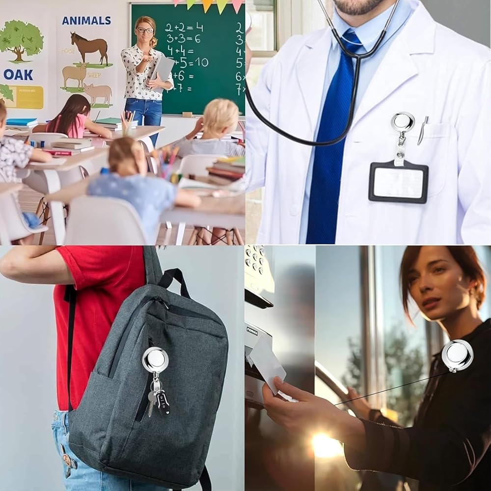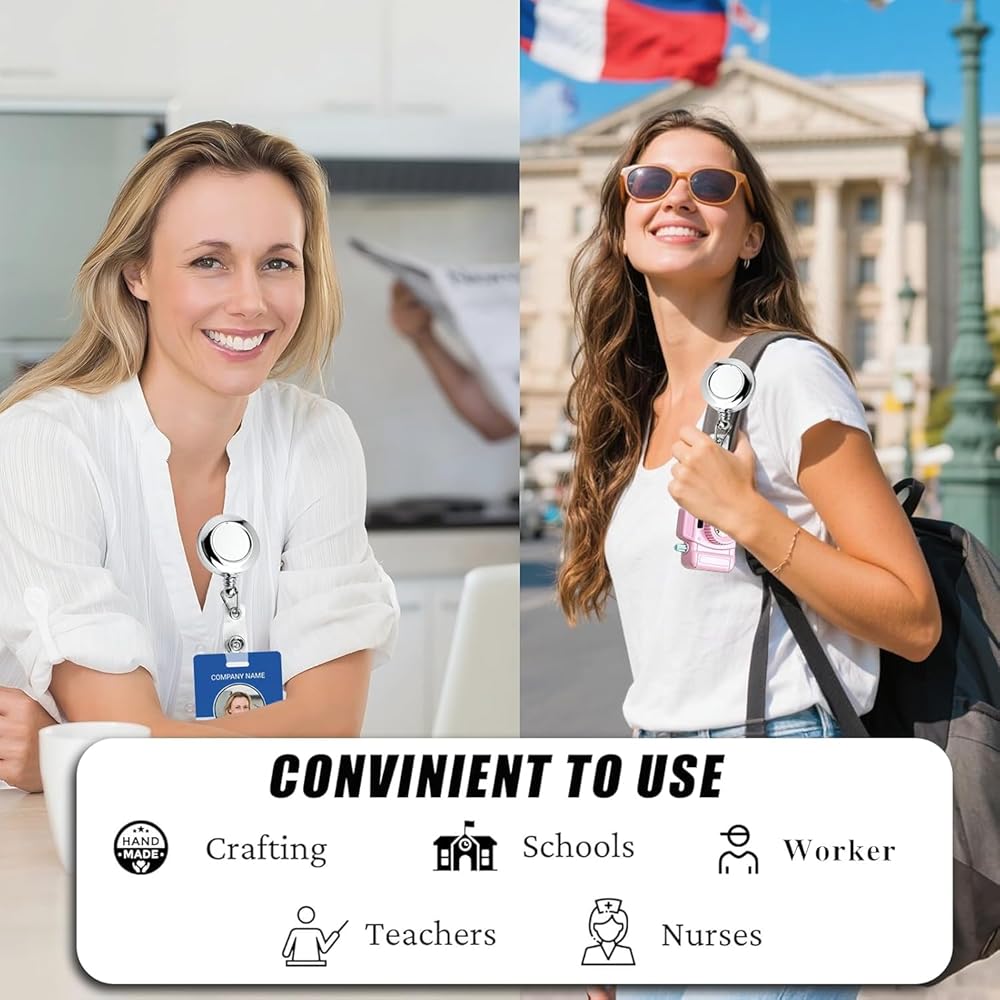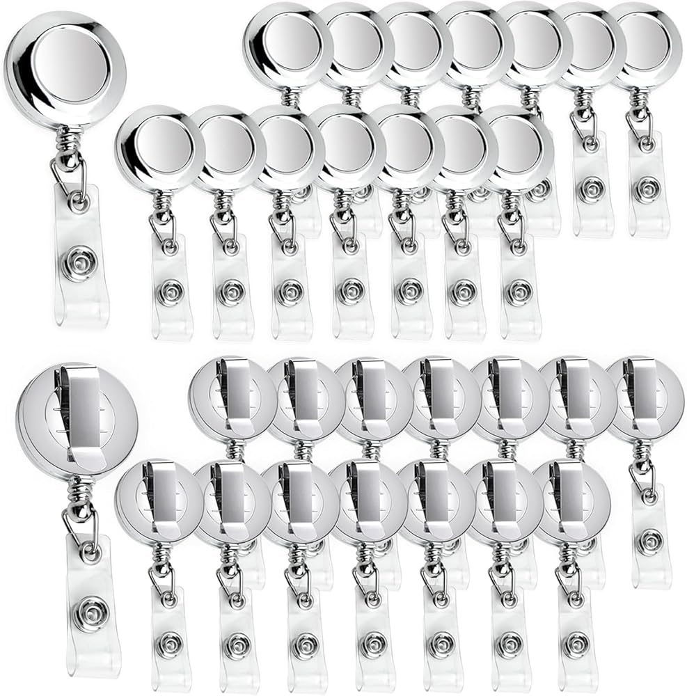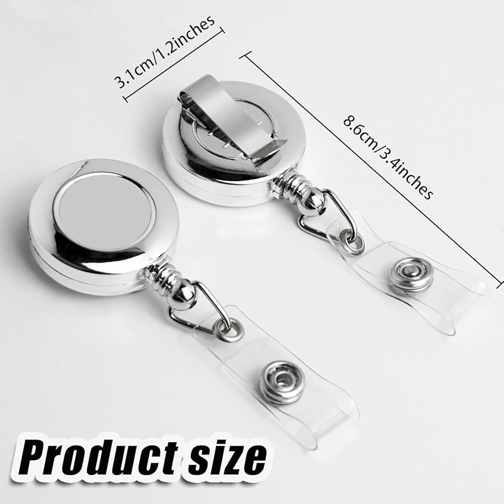 Features: 1. Suitable for ID badge holders, badges, ID cards, lanyards, good for teacher, student, nurse, volunteer, perfect decoration for ID badges. 2. 24 inches long nylon cord. 3. Silver design upgrade your team. 4. Metal belt clips are convenient for you to hang securely onto belt loops. Specifications: Material: Plastic, Metal Diameter: 1.2 inches / 3 cm Color: Silver Retractable cord length: 24 inch/ 60 cm Include: 30 pack Silver retractable badge reels for your ID badge holders.