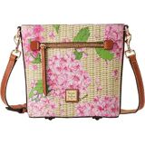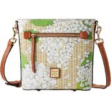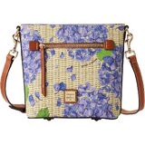 One outside zip pocket. One inside zip pocket. Two inside pockets. Inside key hook. Adjustable, detachable shoulder strap. Strap drop length 26". Lined. Feet. Zipper closure. Dooney & Bourke Hydrangea Basketweave Small Zip Crossbody | White