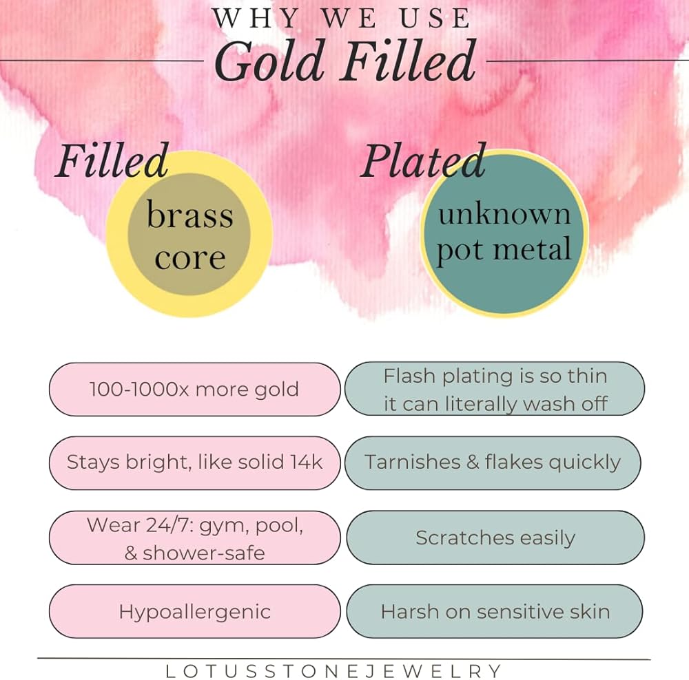 QUALITY - 14K gold filled is a thick layer of 14K over brass – it doesn't flake or wear thin and is made to last decades. It does not tarnish from being in the shower or pool.