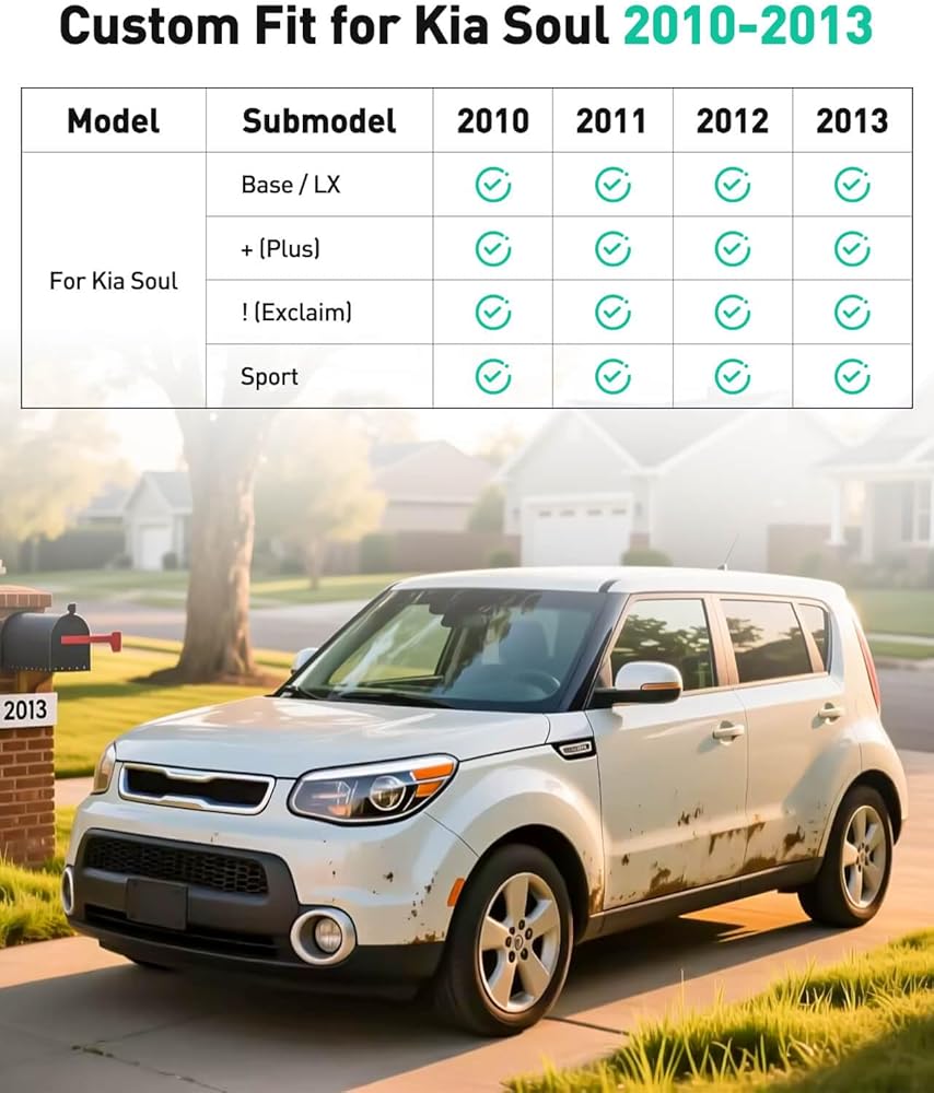 Custom Fit for Kia Soul 2010-2013: Whether you drive a box car for Kia Soul Base, Soul +, Soul !, or Soul Sport models, our car floor mats & cargo liner provide an ideal fit. Fit for Kia Soul 2013 2012 2011 2010