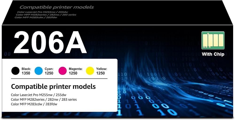 206A Toner Cartridges 4 pack compatible with HP Color Laserjet Pro MFP M283fdw, Color Laserjet Pro MFP M283cdw, Color Laserjet Pro MFP M283fdn, Color Laserjet Pro MFP M282nw, Color Laserjet Pro M255dw, Color Laserjet Pro M255nw, M283 M282 M255 Series Printer