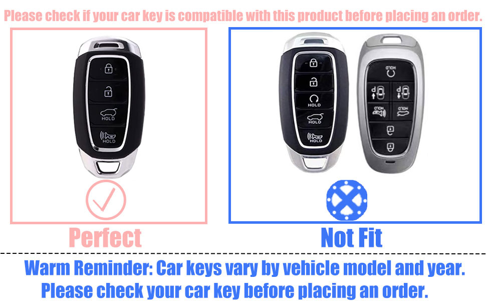 Fits Key Model: The key fob cover is compatible with Hyundai Santa Fe Palisade Kona Elantra GT Veloster (2019 2020 2021 2022) 4 buttons smart key. The model is only for reference, please DOUBLE CHECK your key shape and button labels carefully to make sure it is the same as the second picture.(NOTE: same brand car may have different car key model.)