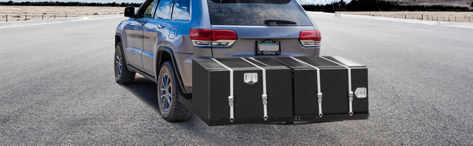 【DURABLE BUILD】 This trailer hitch cargo carrier is constructed from steel to promote high strength. It is rated for 300 lbs. It is also finished with a coat and carbide black powder coat for long-lasting corrosion resistance
