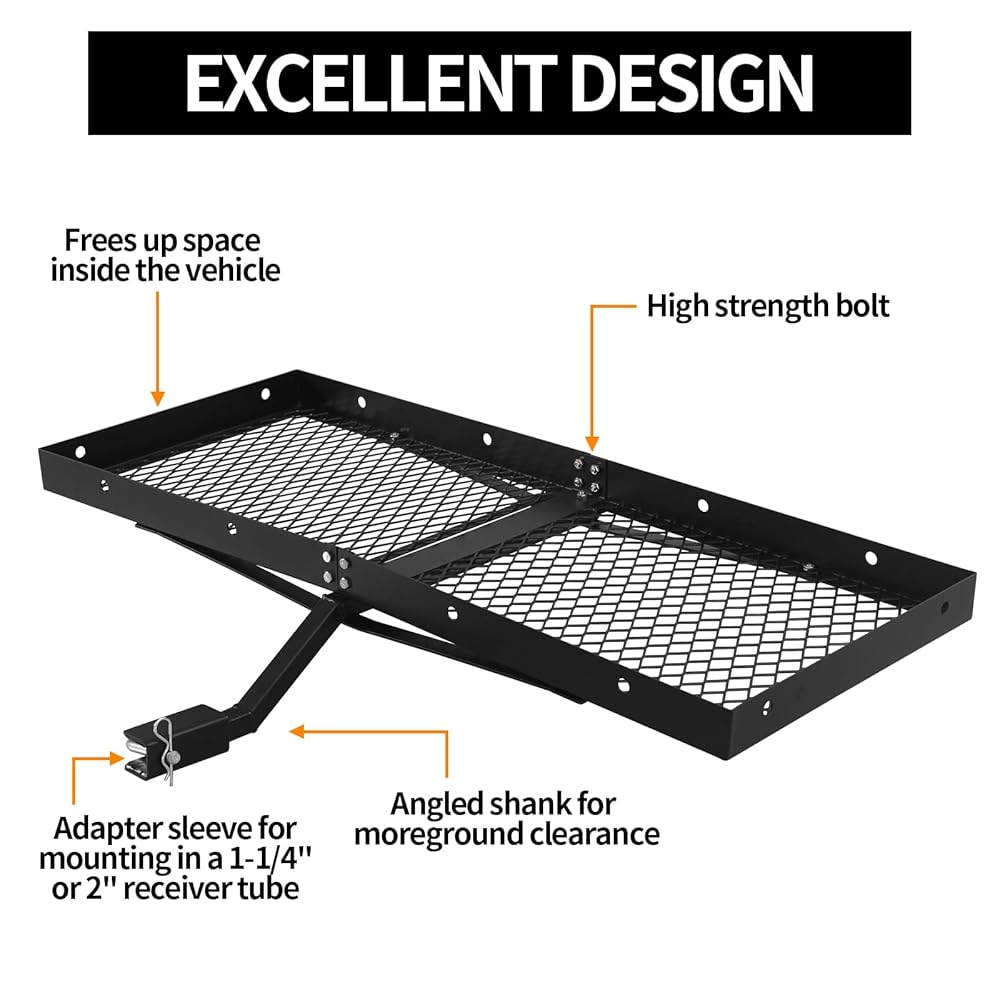 【ADAPTABLE】 This cargo hitch carrier comes with an adapter sleeve to allow the shank to fit virtually any industry-standard 2-inch trailer hitch receiver. This cargo hitch carrier is also equipped with an angled shank