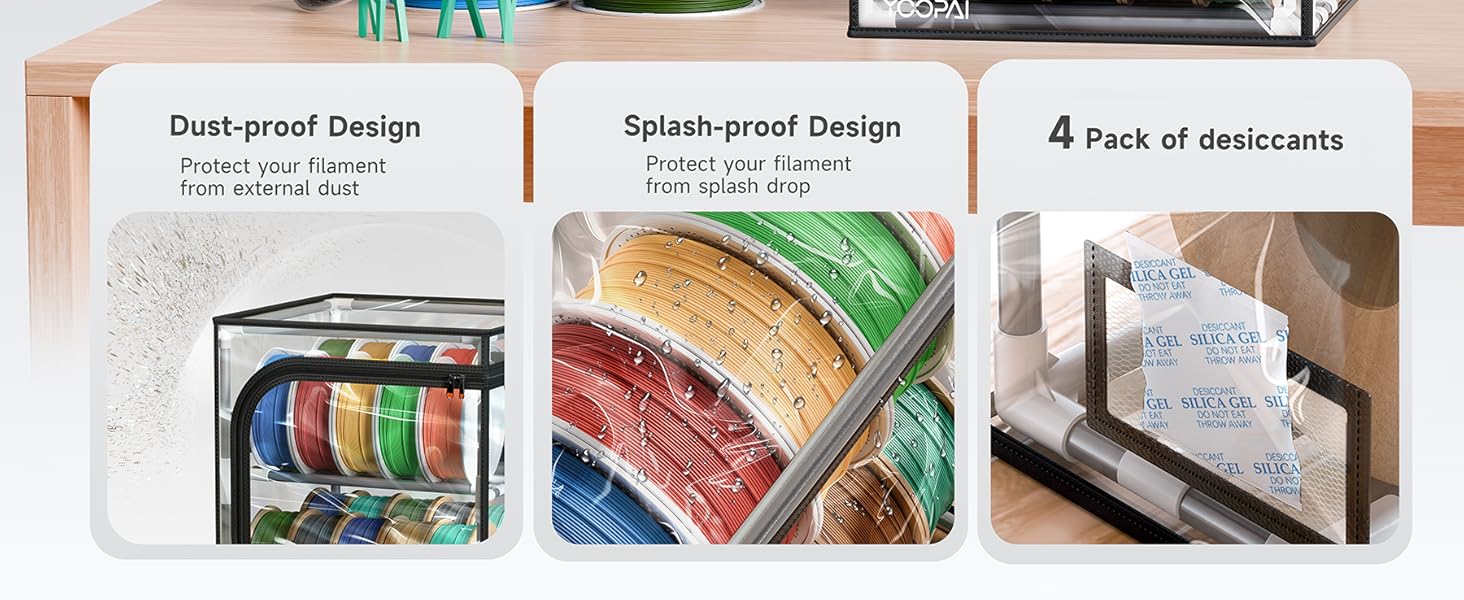 Designed for Filament Storage, Not a Drying Box – Includes desiccants to help reduce short-term moisture exposure, but this filament storage box is intended for organization and frequent use, not sealed or active drying