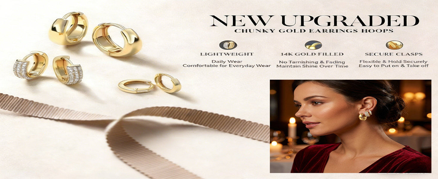 LIGHTWEIGHT COMFORT:Despite their bold visual impact, these gold hoops are engineered to be feather-light. The hollow-tube construction of the chunky hoop and the refined profile of the huggies ensure they won't pull on your earlobes or cause fatigue. The secure click-top closures are easy to put on and take off, yet sturdy enough to stay in place. They are so comfortable you might forget you are wearing them.