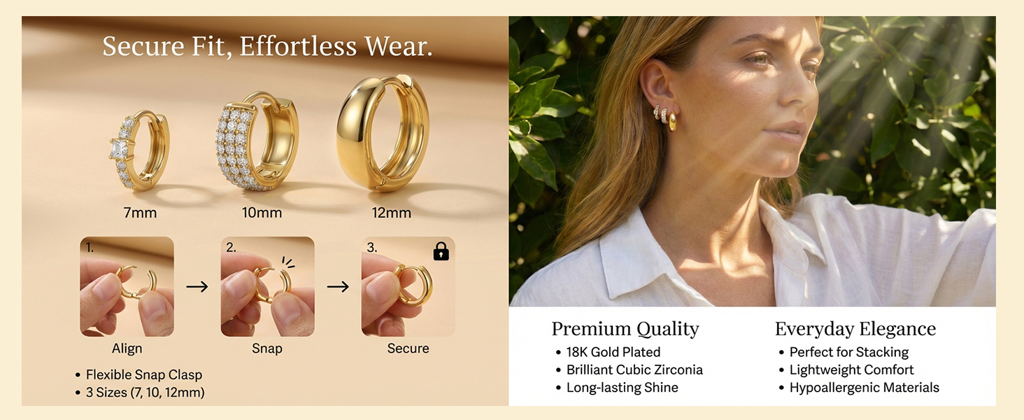 HYPOALLERGENIC & SKIN-FRIENDLY CRAFTSMANSHIP:Designed for the most sensitive ears, our huggie earrings are crafted from a premium brass core and finished with genuine 18K Gold Plating. This high-quality protective layer ensures a long-lasting, brilliant shine that is resistant to tarnishing. We strictly adhere to safety standards, ensuring our jewelry is Nickel-Free and Lead-Free. You can wear them daily without worrying about irritation, itchiness, or your skin turning green, making them the ultimate choice for comfort and health.