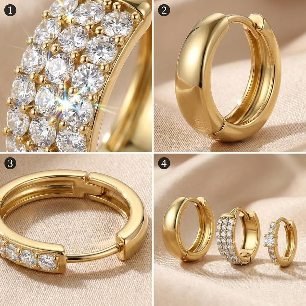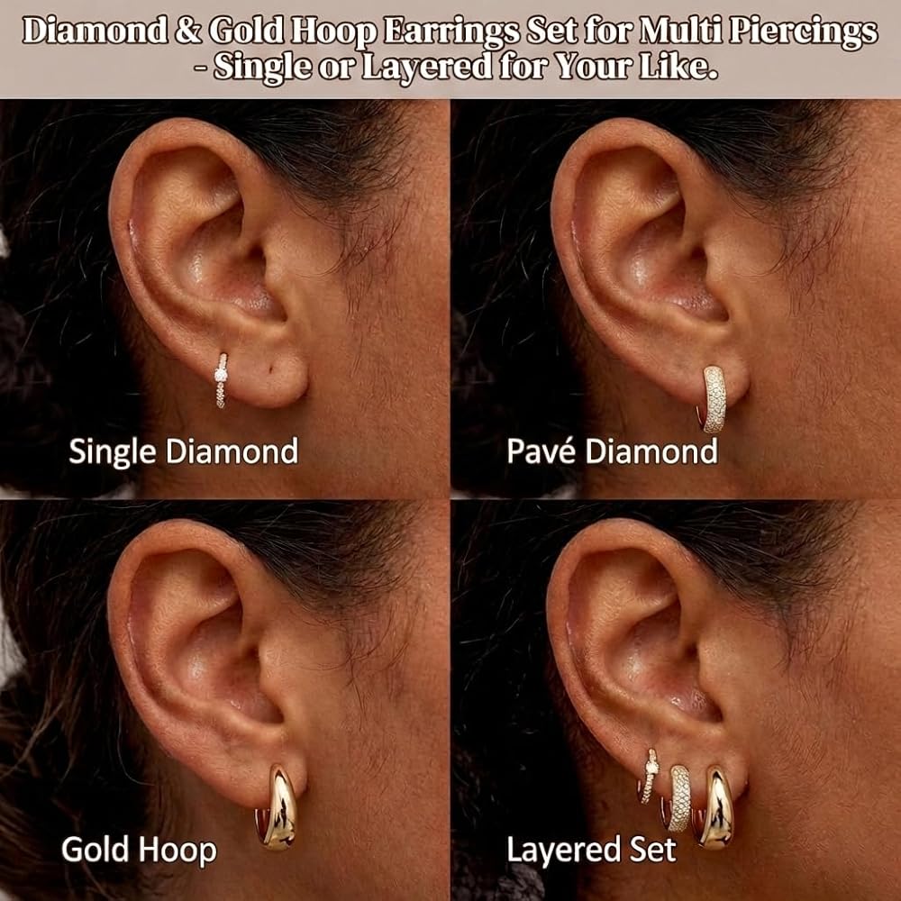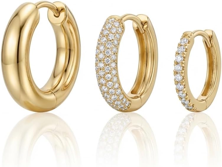 CURATED 3-PIECE MULTI-PIERCING SOLUTION:Take the guesswork out of styling your ear stack. This set is expertly curated to create a balanced, high-fashion look instantly. It features three distinct styles: a bold chunky dome hoop for modern volume, a pave cubic zirconia huggie for sparkle, and a delicate solitaire charm hoop for a touch of elegance. Whether you have two or three piercings, this set provides a cohesive "curated ear" aesthetic that mimics the trends seen on social media and celebrity styles.