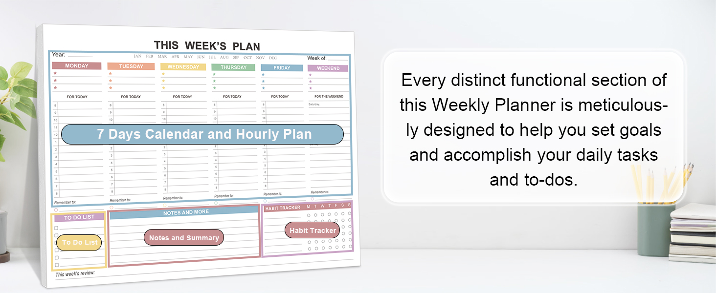 Clear Sections for Simplified Planning - Gain a clear weekly overview with dedicated sections for Daily Schedule, To-do List, Notes, and Habit Tracker. Boost productivity with this well-organized desk pad, a must-have desk accessory. This versatile weekly pad allows you to stay organized in 2026, 2027 or even as far ahead as 2028—your essential long-term planning desk accessory.