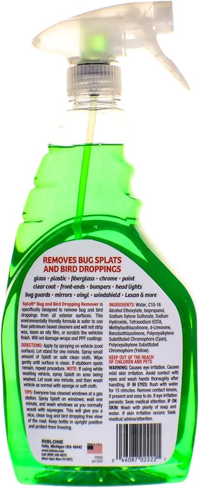 Splatt Bug and Bird Dropping Remover quickly and safely removes these unsightly “splats”. Safe and effective to use on ANY part of your vehicle, it will not strip wax or clear coat. Designed to remove bug and bird droppings from all exterior surfaces. Removes bug and bird splats from glass, plastic, fiberglass, chrome, paint, clear coat, bumpers, head lights, bug guards, mirrors, vinyl, lexan and more. For use on cars, trucks, boats, SUV's, Motorcycles, RV's. Will not leave an oily film and will not damage wraps and PPF coatings. Apply by spraying on and cool vehicle surface. Let stand for one minute. Spray small amount on safe, clean cloth and wipe gently until surface is clean. If stubborn spots remain, repeat procedure. Note: If using while washing vehicle, spray Splatt on are being washed. Let soak for one minute, then wash vehicle as normal with sponge or soft cloth.