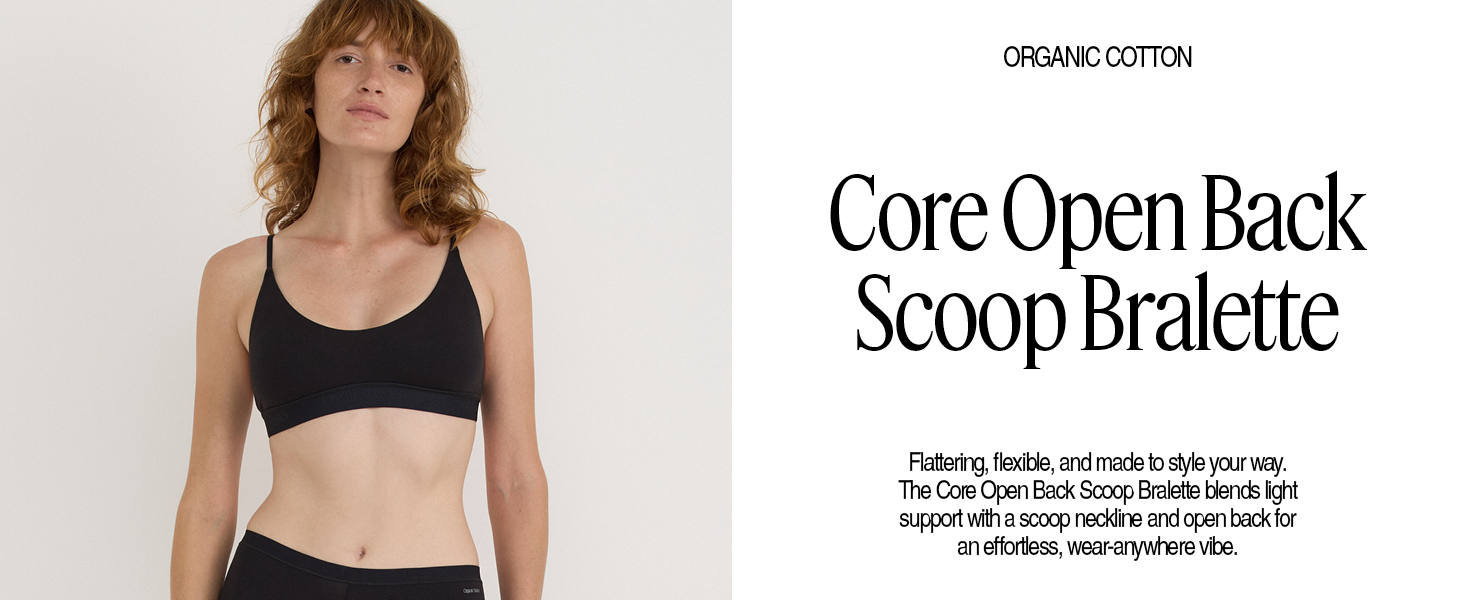 Experience unparalleled comfort with our Core Open Back Scoop Bralette, crafted from 95% organic cotton. This soft and smooth bralette is designed for everyday wear, featuring adjustable straps and a soft elastic underband for a perfect fit. The pullover style ensures maximum comfort without the hassle of closures. - Made with 95% organic cotton for a soft, breathable feel - Adjustable straps for a customizable fit - Soft elastic underband with embossed logos for added style - Pullover design eliminates hook-and-eye closures for comfort - Machine washable for easy care