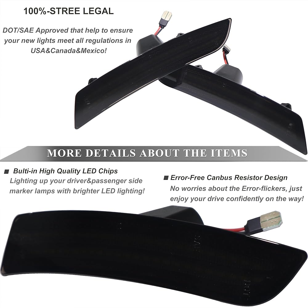 • 1. Smoked Lens Side Marker Replacement for Chevy Camaro. Replace the OEM Part Numbers# 23169181, 23169182, 23169179, 20896549, 20896550, 23169180.