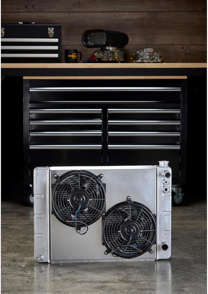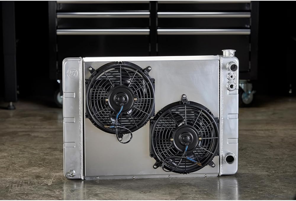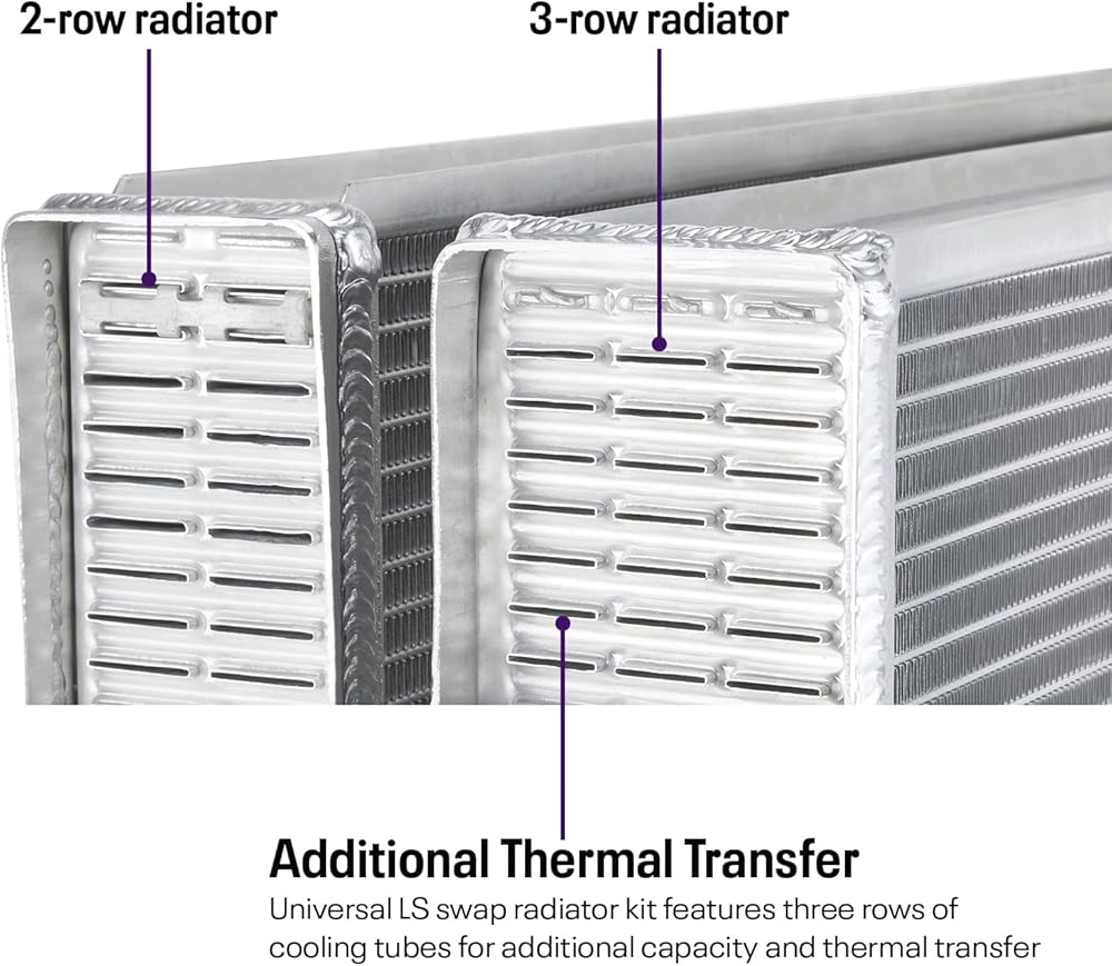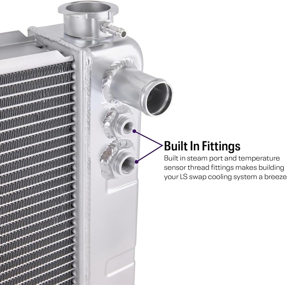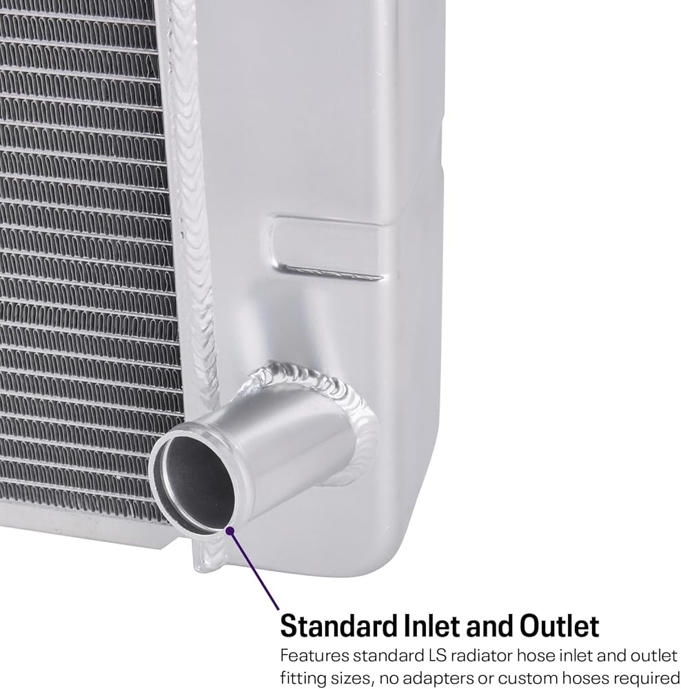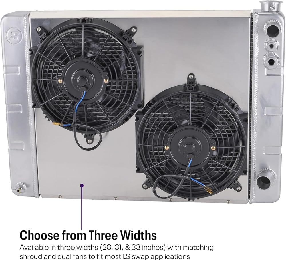 Ready to run kit includes aluminum fan shroud, dual 10-inch or 12-inch fans, and mounting hardware. Fabricated aluminum end tanks with high-flow 3-row aluminum core. Furnace brazed construction with TIG welded end tanks, no epoxy sealer or tank crimps/O-rings to fail. Available in three widths (28”, 31”, and 33”) to accommodate various core support openings. Dual pass cross flow radiator core to maximize coolant thermal transfer. Three rows of .790-inch core tubes for extra coolant capacity and more cooling fin contact. Approximate 17 percent increase in cooling system capacity over typical 2-row radiators. Radiators include integrated steam port and temperature sensor NPT thread fittings. Billet aluminum filler neck is stronger and seals better than cast filler necks. Features standard LS-spec 1.25” upper and 1.50” lower radiator hose fittings. Integral transmission cooler with standard 1/2-20 inverted flare female (IFF) fittings. Keep Your LS Swap Build Cool Using Our Universal Fit Double Pass Aluminum Radiator The LS engine has found its way under the hood of just about every make and model you can think of since it became the darling of the engine swap world. Compact, powerful, tons of upgrade and performance options, and most of all, easy on the wallet, the LS swap has become common place. The more interesting swaps require a little planning and fabrication to pull off a successful swap, but they quite often turn the most heads and are often the most talked about vehicles at a show. The thing is the LS cooling system can be a head scratcher for some. More so than fabricating a set of motor mounts even. The cooling system utilizes a surge tank setup and two or four steam port outlets from the cylinder heads. This complicates the cooling system design and often leads to overheating issues due to not fully understanding how the LS cooling system works in an LS swap environment