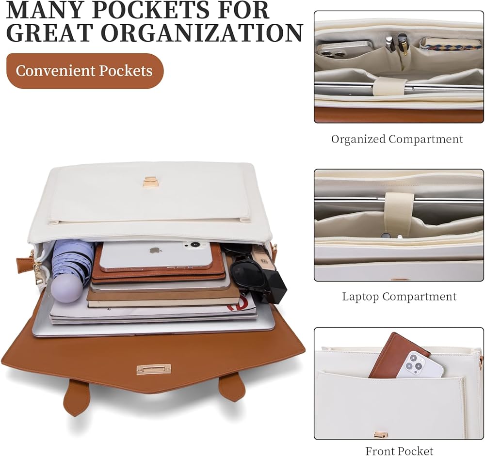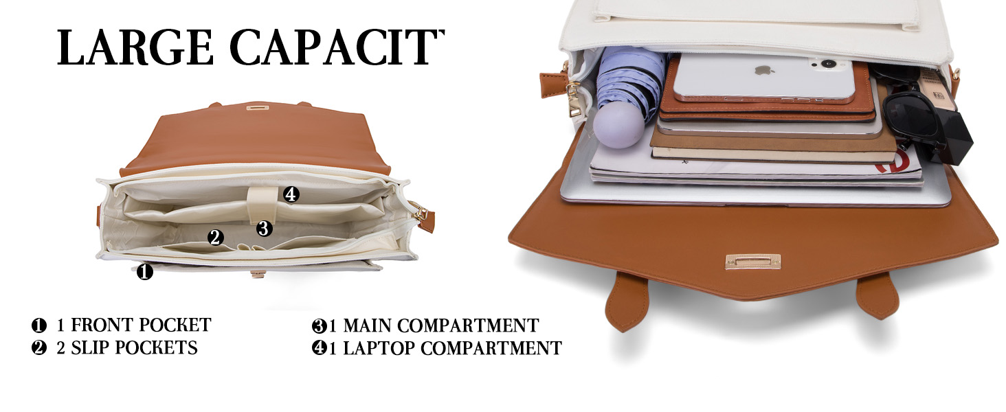 Large Capacity: The womens tote bag offers ample space for a 15.6 inch laptop and iPad, documents, wallets, cables, makeup, and other daily accessories. With 3 small pockets, 1 front pocket for quick access to your essentials, everything has its place in this laptop messenger bag.
