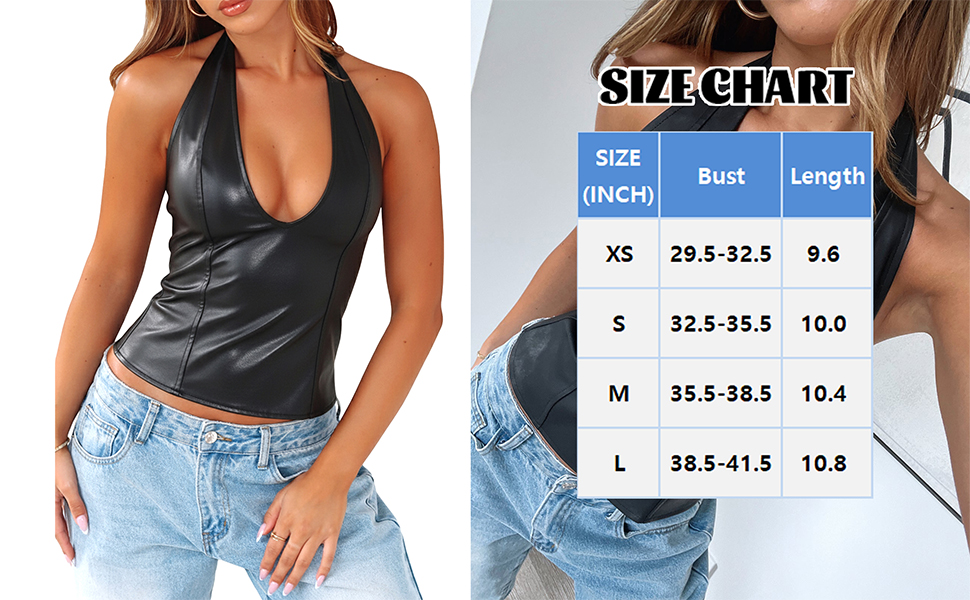 - Features: Adjustable leather halter tops; Deep v neck; Side zipper; Backless crop tops; Slim fit