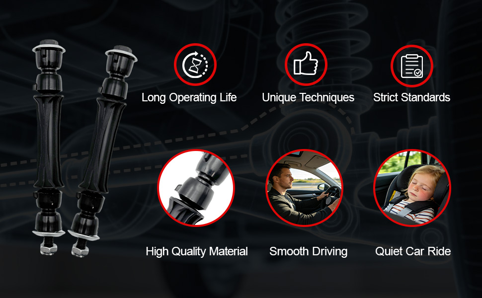 [Function]:Telltale signs your sway bar links need replacing: clunking/clicking when turning or hitting bumps, wobbly/misaligned steering wheel, poor handling, uneven tire wear, and visible suspension damage. Swap old parts for our premium sway bar links—they'll wipe out those frustrating suspension noises, delivering a smooth, enjoyable drive