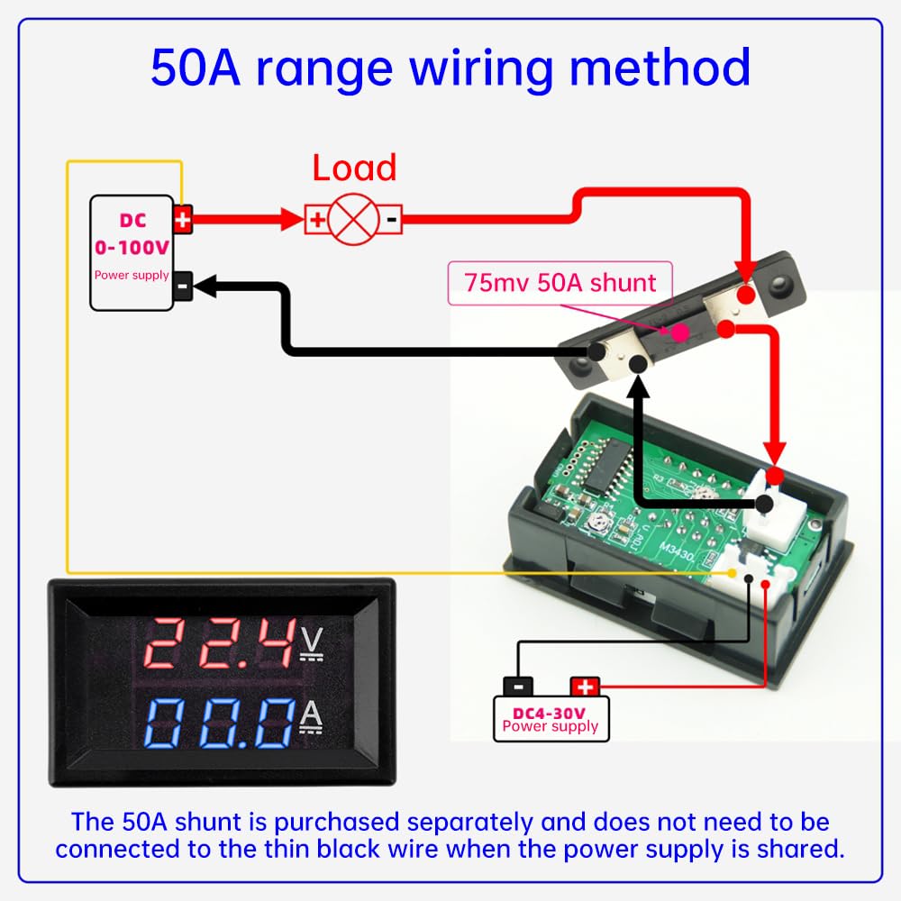 DC 4.5-100V Digital Volt Amp Voltmeter, 0-50A Digital Voltmeter,12V 24V 0.28" Dual LED Ammeter Multimeter Panel, Current Meter Volt Tester with 50A 75mV Shunt(Red&Blue)
