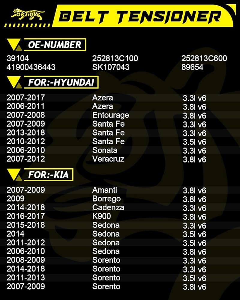 Oktiger Belt Tensioner Assembly with Pulley Fit for Hyundai Azera Santa Fe Entourage Veracruz,Fit for Kia Amanti Cadenza Sedona Sorento 2006-2018, OE# 41900436443, 252813C100,39104