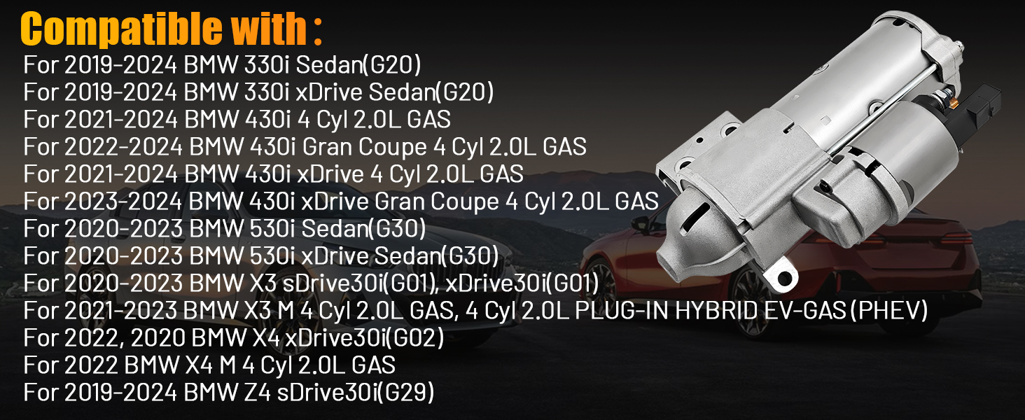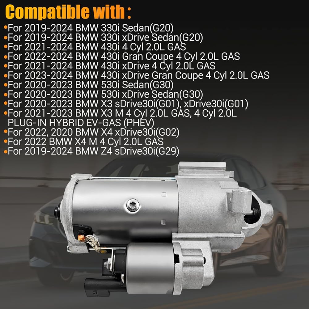 【Application】12418693976 Starter motor compatible with BMW 330i Sedan(G20) 2019-2024; For BMW 330i xDrive Sedan(G20) 2019-2024; For BMW 430i 4 Cyl 2.0L GAS 2021-2024; For BMW 430i Gran Coupe 4 Cyl 2.0L GAS 2022-2024; For BMW 430i xDrive 4 Cyl 2.0L GAS 2021-2024; For BMW 430i xDrive Gran Coupe 4 Cyl 2.0L GAS 2023-2024; For BMW 530i Sedan(G30) 2020-2023; For BMW 530i xDrive Sedan(G30) 2020-2023; For BMW X3 sDrive30i(G01), xDrive30i(G01) 2020-2023; For BMW X3 M 4 Cyl 2.0L GAS, 4 Cyl 2.0L PLUG-IN HYBRID EV-GAS (PHEV) 2021-2023; For BMW X4 xDrive30i(G02) 2022, 2020; For BMW X4 M 4 Cyl 2.0L GAS 2022; For BMW Z4 sDrive30i(G29) 2019-2024