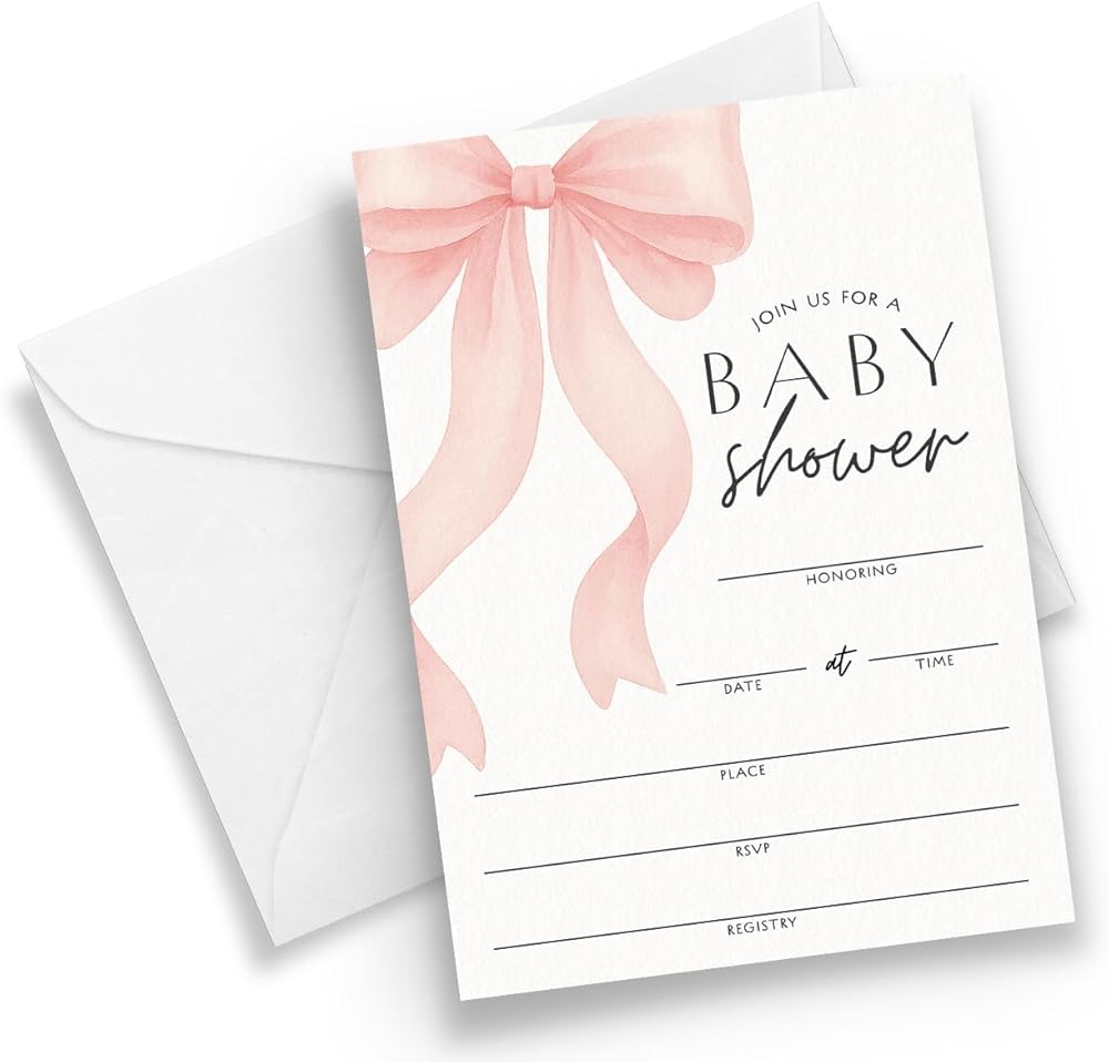 Pink Bow Design – Sweet and classic with soft blush accents, pairs perfectly with girl baby shower décor and pink-themed party supplies