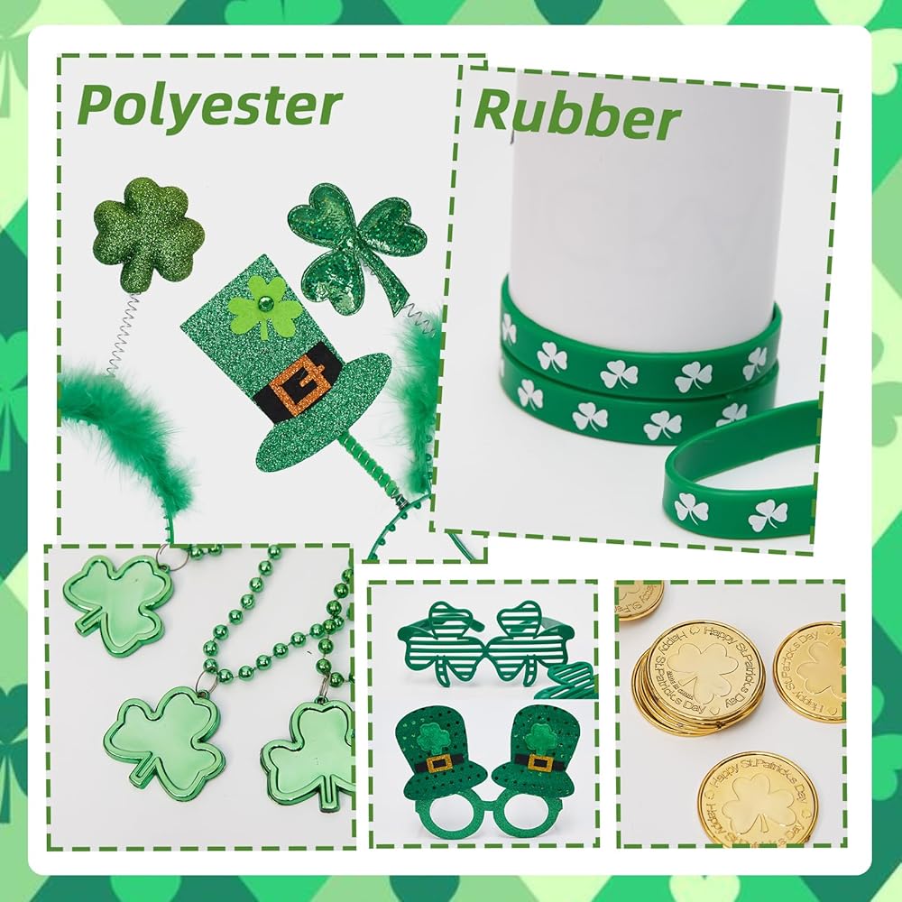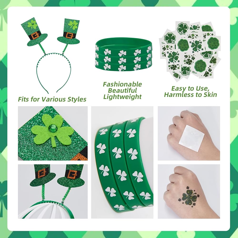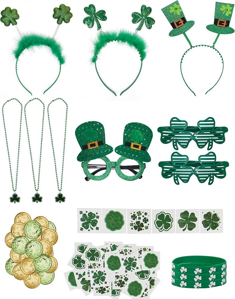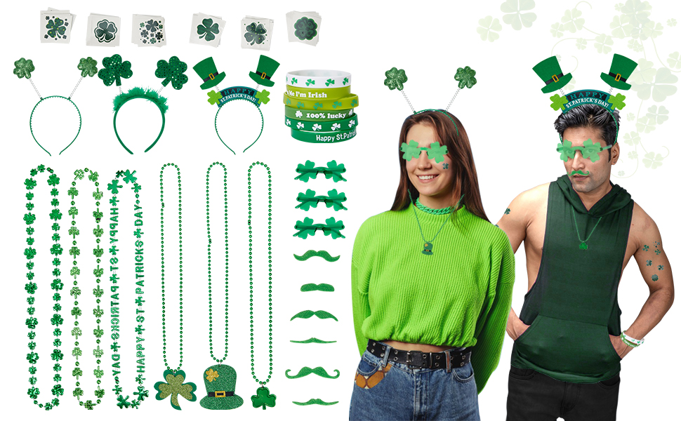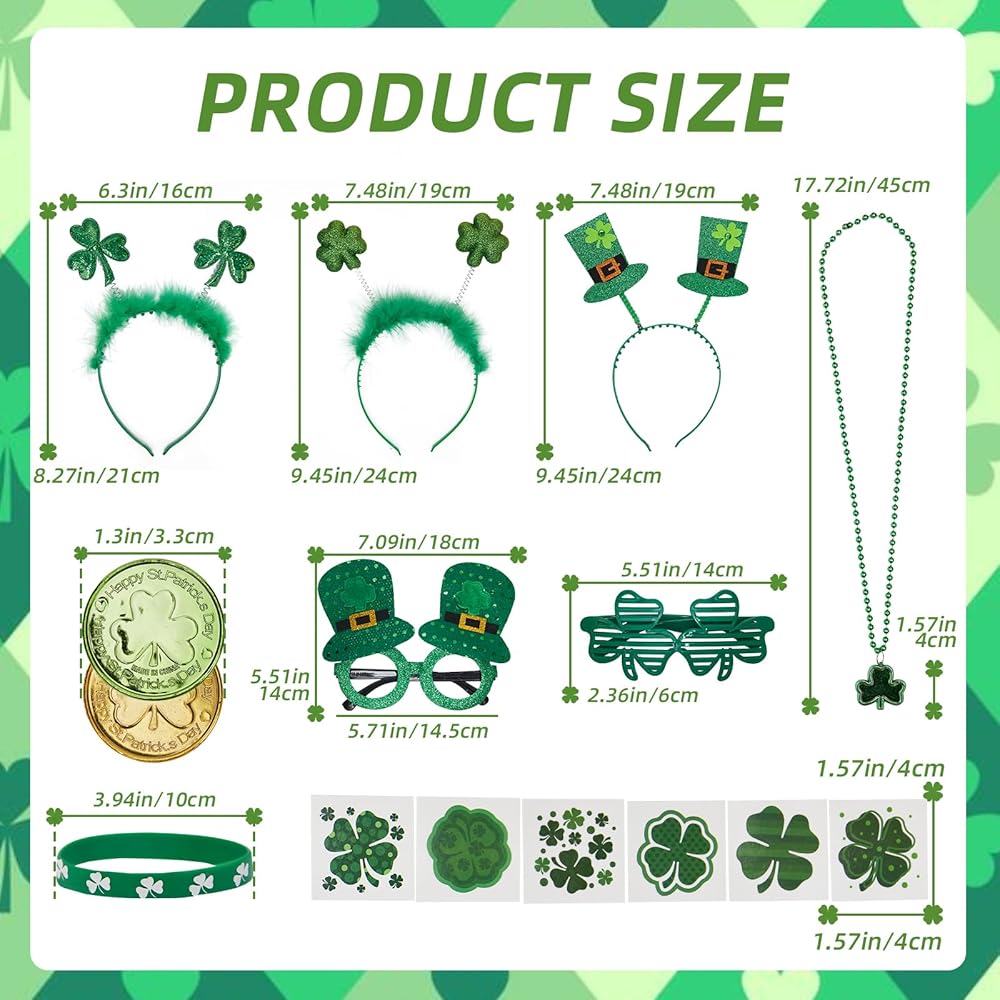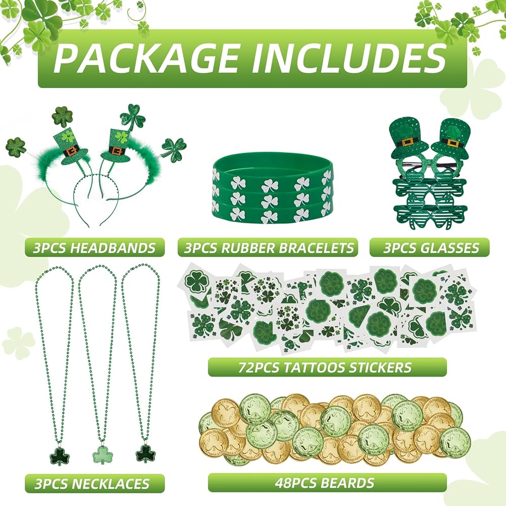 Package: You will get 3*Headband, 3*Glasses, 3*Necklace, 3*Bracelet, 48*Coin, 72*Transfer Tattoos for St. Patrick's Day Dress Up Costume Accessories Outfit Suit for Women Men.