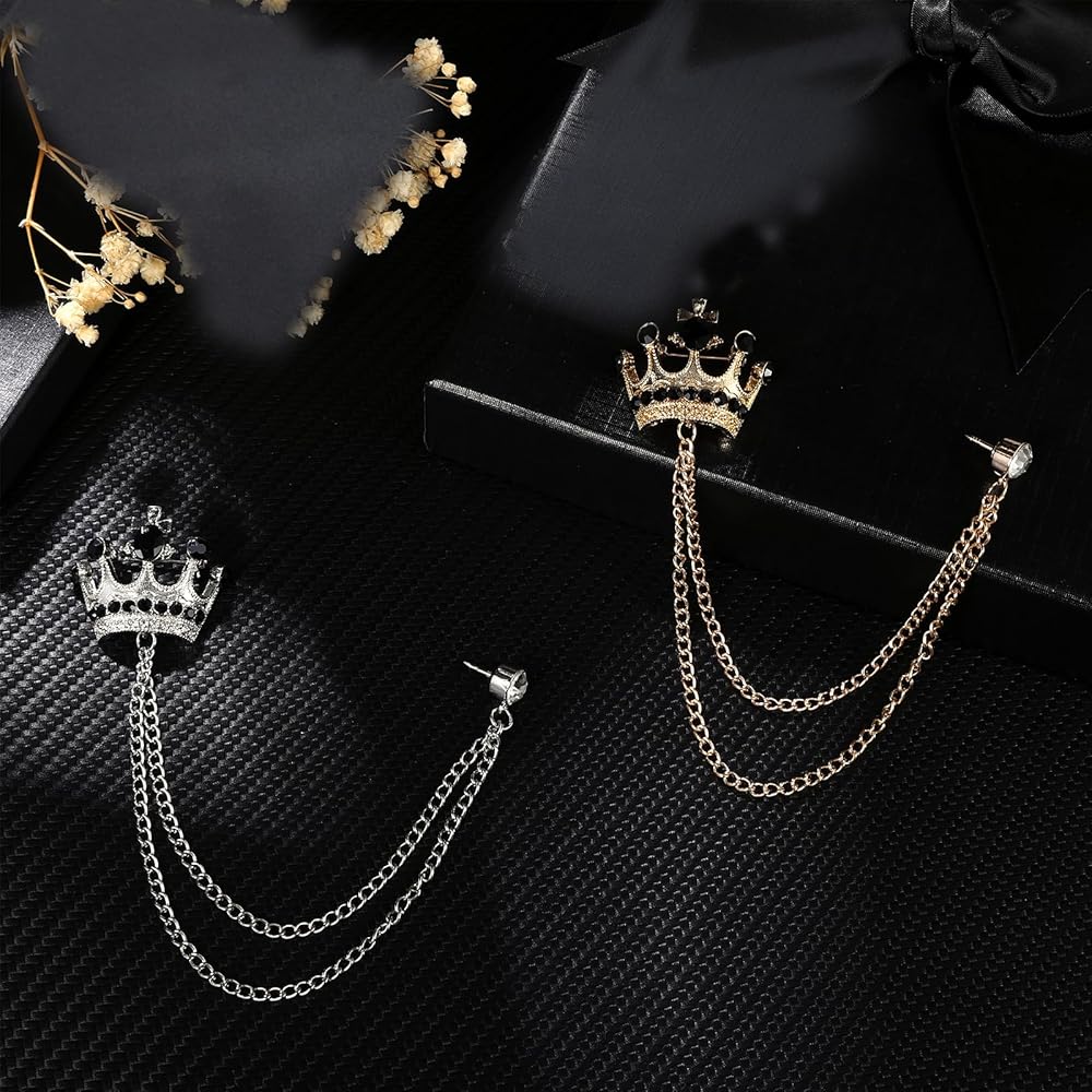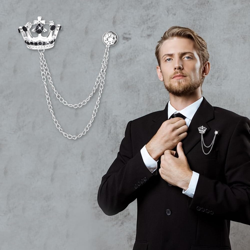 Perfect Size: The crown size of our brooch for men suit: 3x3.5cm / 1.2x1.4inch (length * width), long chain length: 17cm / 6.7inch, short chain length: 14cm /5.5inch, only 12 grams, you can't even feel its existence. This brooch for men allows you to be dazzling in any light without any burden