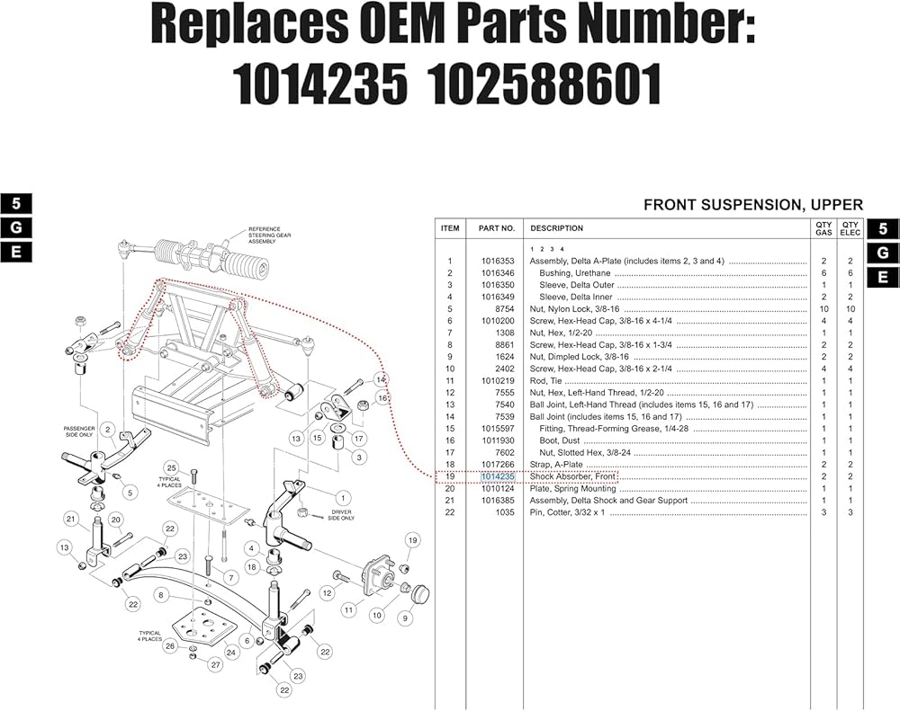 Direct-Fit Front Shock Pair — Wide Club Car Compatibility:Matched left & right front shocks engineered to fit Club Car DS (1981–2011) and Precedent (2004-up) gas & electric models. Cross-replaces common OEM numbers (1014235 / 102588501 /1033510-01 / 1010991) for fast part verification.