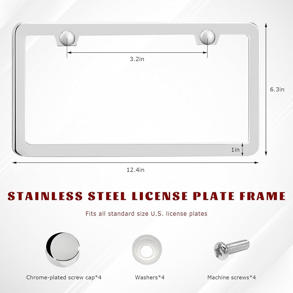 2 PCS License Plate Frames, 2 Holes Rust-Proof License Plate Holder with Screws Kit, Stainless Steel Front Rear Tag Cover for Most Vehicles, Universal Car Accessories