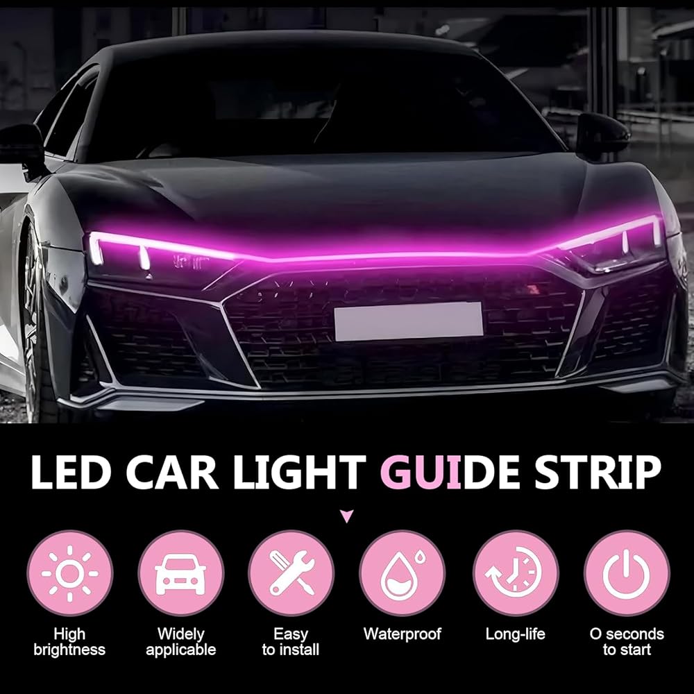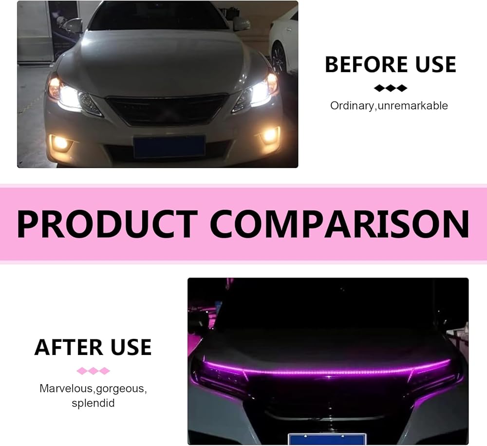 Easy to Install: This car led hood light comes with a strong adhesive backing, tear off the protective layer can be directly pasted on the target area cleaned in advance, strong adhesion, not easy to fall off during driving.