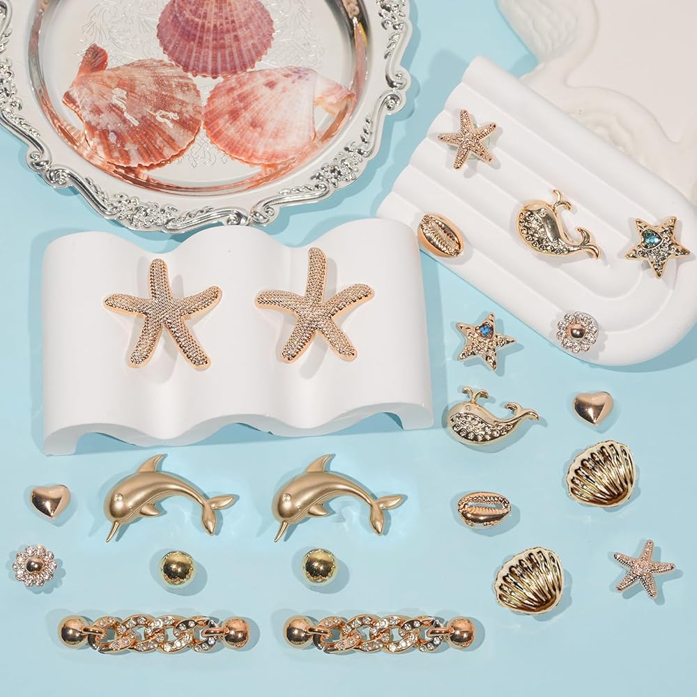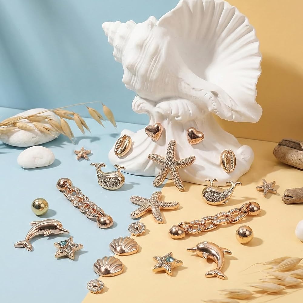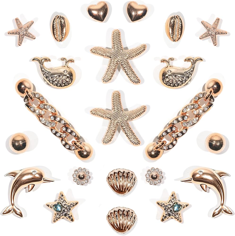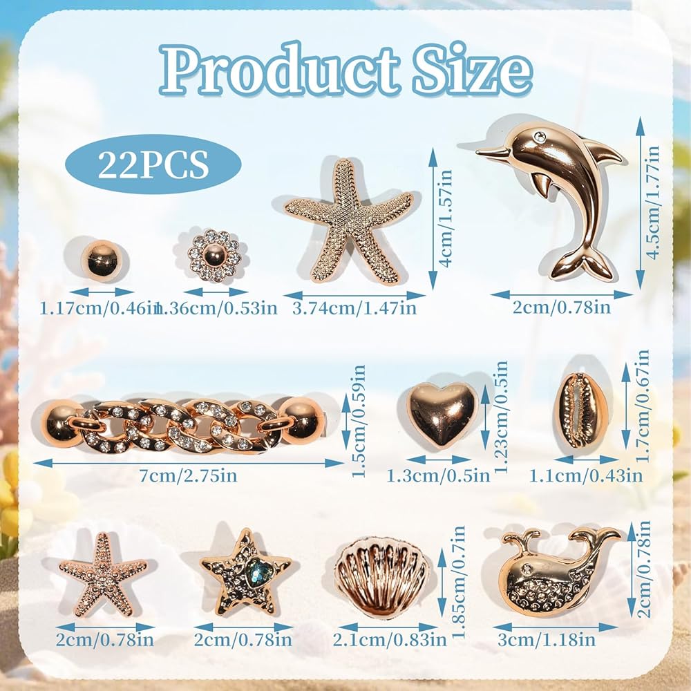 1.Add a wave of sparkle and personality to your footwear collection with our stunning 22pcs gold ocean shoe charms Set!Designed for the modern woman who loves to showcase her unique style,these dazzling accessories transform ordinary shoes into extraordinary fashion statements.