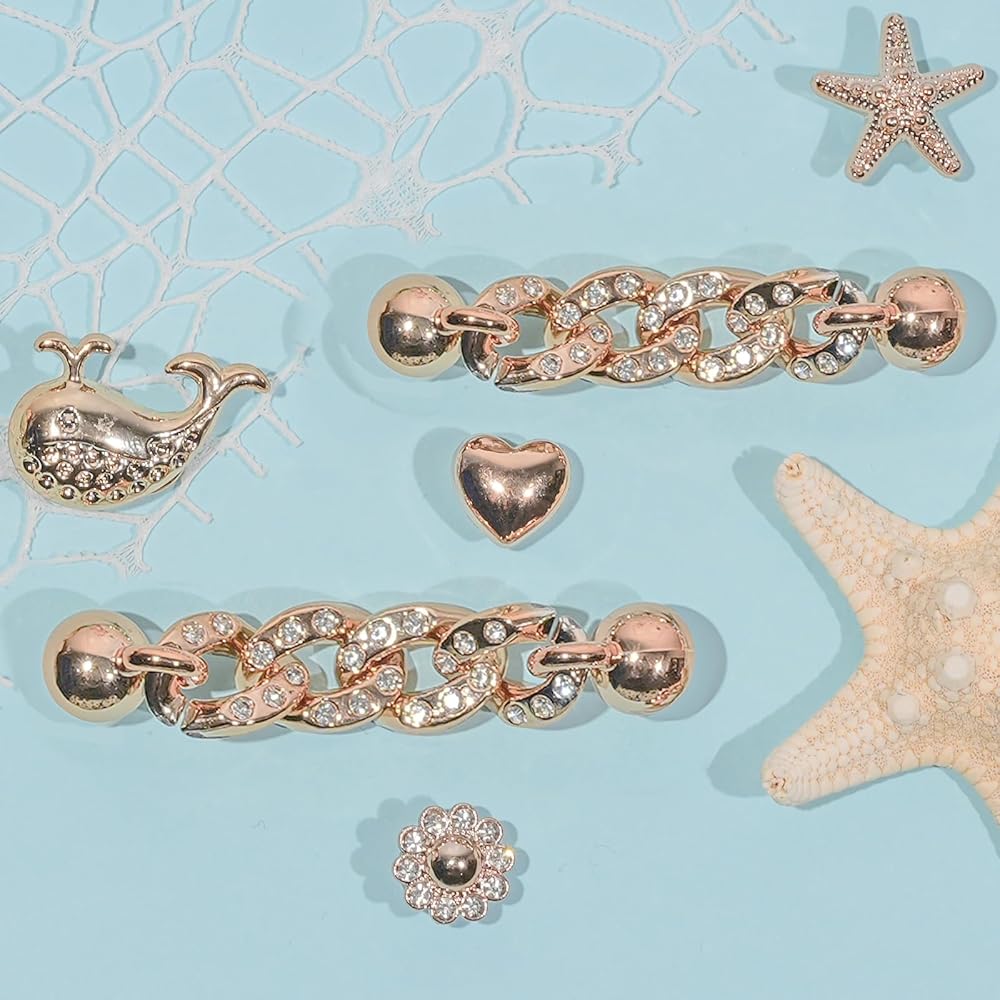 【Package Includes】You will receive 22 pieces of bling ocean shoe charms.As shown in the picture,this set includes gold starfish,dolphins,whales,seashells,rhinestone shoe chains,etc.Enough to meet your matching needs.Ample variety to mix,match,and create multiple dazzling designs on different shoes.