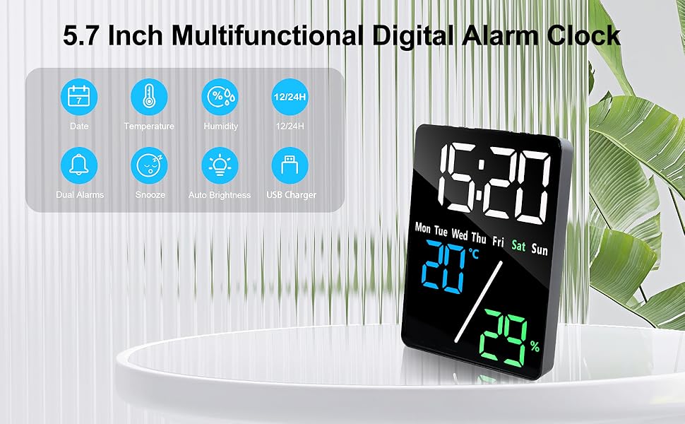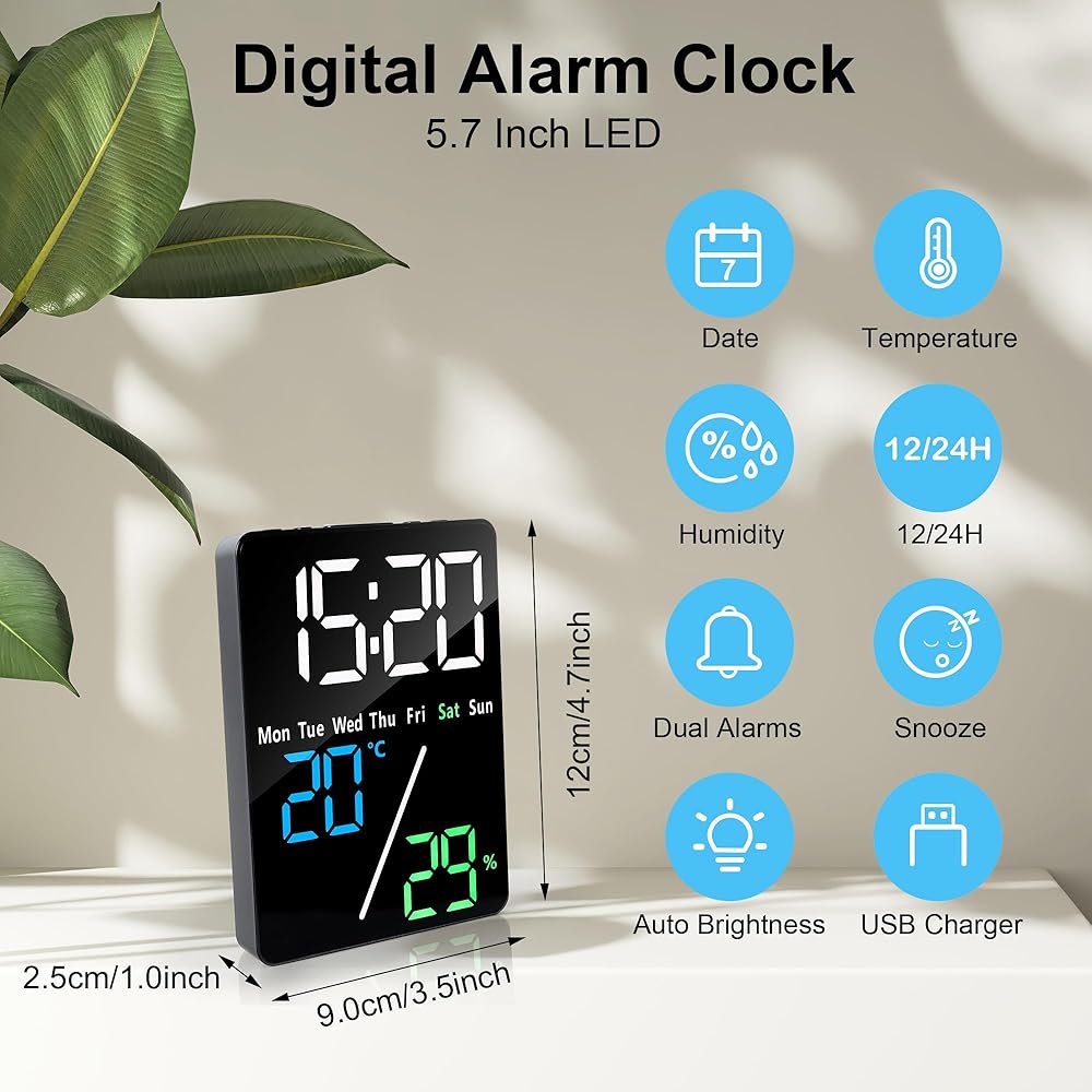 5.7 Inch LED Display: Digital alarm clock has a 5.7 inch LED screen and large numerals, making it easy to read the time, temperature and humidity even from a distance. Its modern and stylish appearance makes it a fashionable scenery to your bedroom or living room.