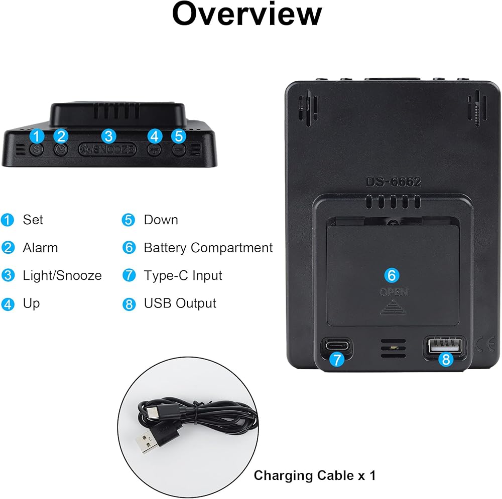 USB Charging Output: Comes with 1 meter long USB power cable, this LED digital clock keeps screen on when powered by cord and a separate USB output port can allow you to conveniently charge your phone at night.