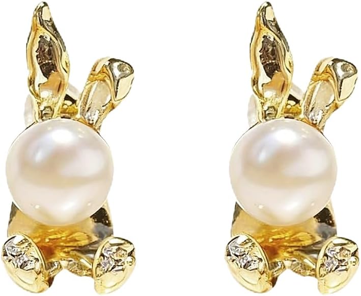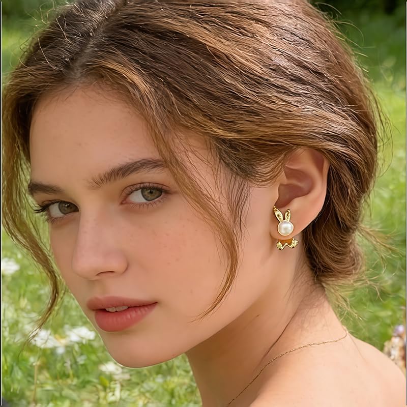 Easter Bunny Earrings for Women,Vintage Round Pearl Rabbit Studs Earrings,Gold Rabbit Front Back Stud Earrings,Minimalist Sweet Bunny Pet Small Earring,Jacket Earrings for Women Party Jewelry