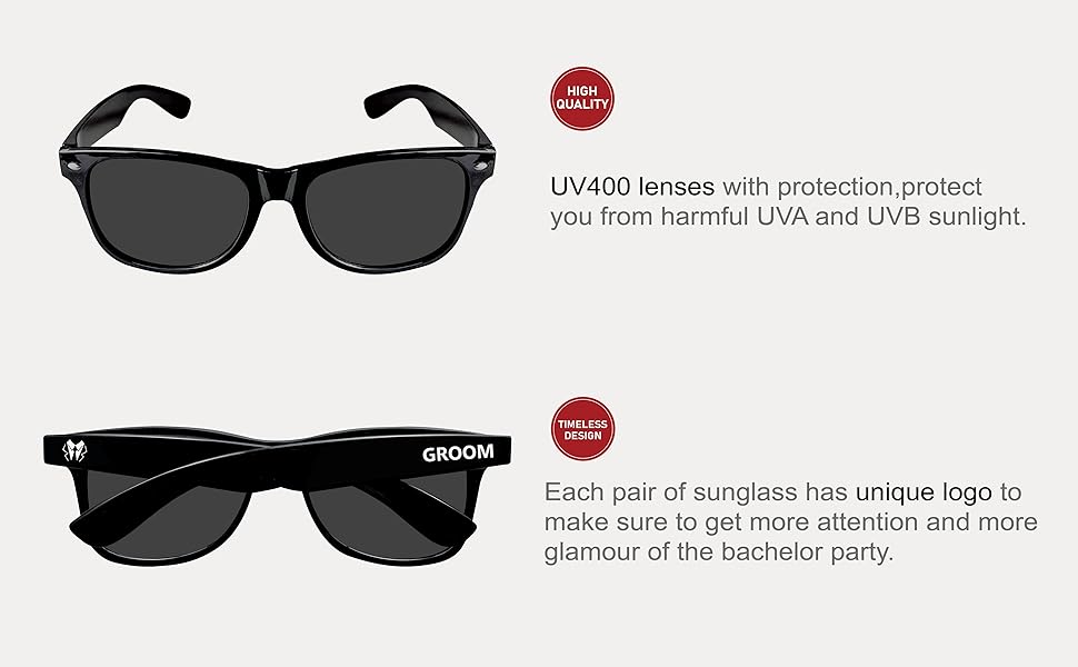 【UV400 Protection】:These groomsmen sunglasses with shatterproof UV400 lenses can block UVA and UVB radiation. UV400 bachelor sunglasses set not only provides sufficient sun protection, but also make you look absolutely charming on the beach. Whether at the bachelor party or for wedding photo shoots, these bachelor sunglasses party pack will elevate your overall style.