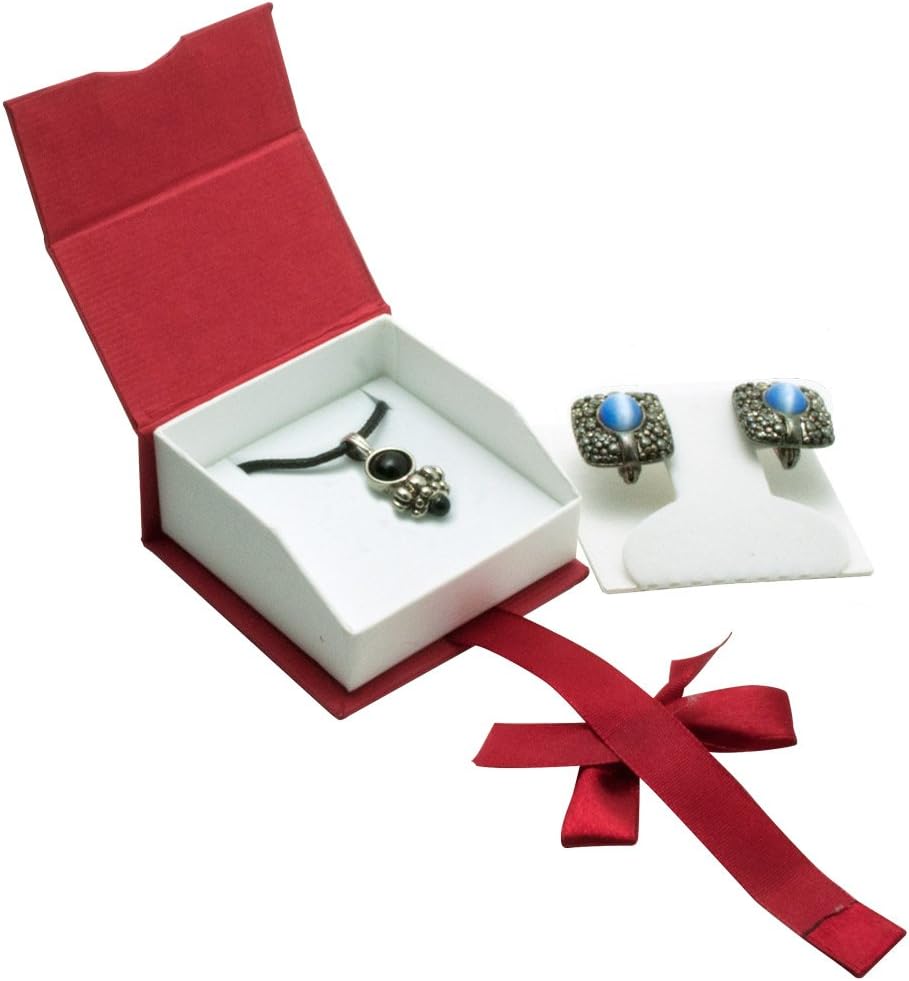 This box has a T-shaped insert that will work well for earrings or pendants. The elegant paper box has a red bow that wraps around the front of the box and fastens with a magnetic closure. It's easy to make a beautiful presentation with these boxes!