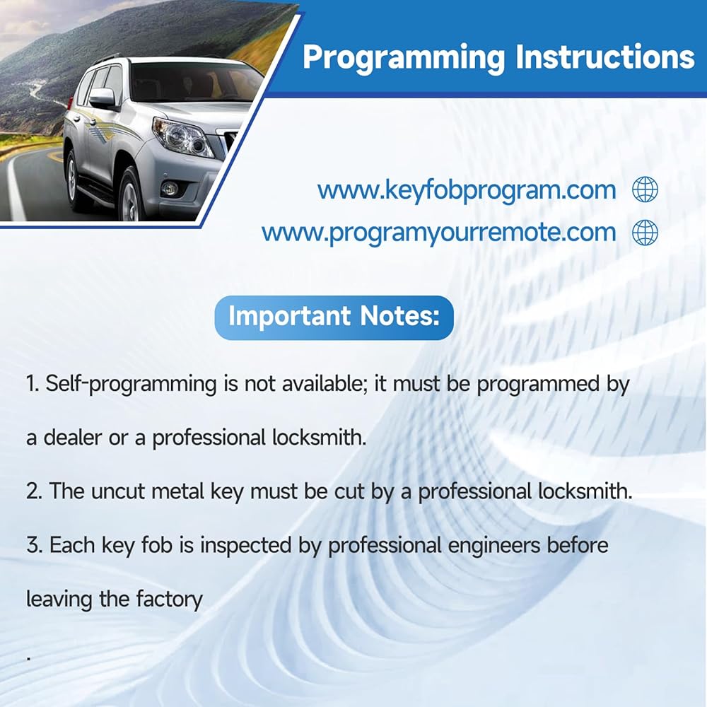 PROGRAMMING:The uncut portion of the key must be cut by a professional locksmith. Self-programming is not available; the key must be programmed by a dealer or a professional locksmith. Every key is rigorously tested by experts before shipping