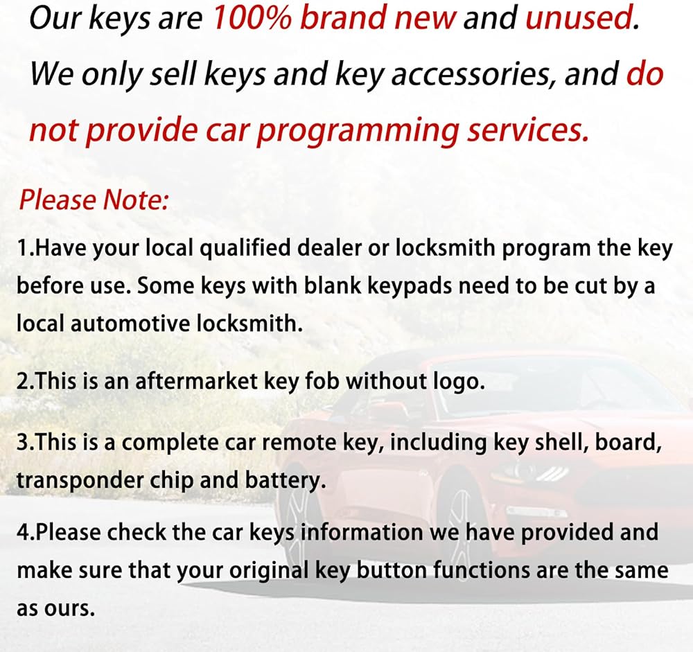 Testing & Reliable: Each car key fob is fully pre-tested by professional locksmith tools before shipping. This is aftermarket remote key fob/Non-OEM, however, functions like the original car key
